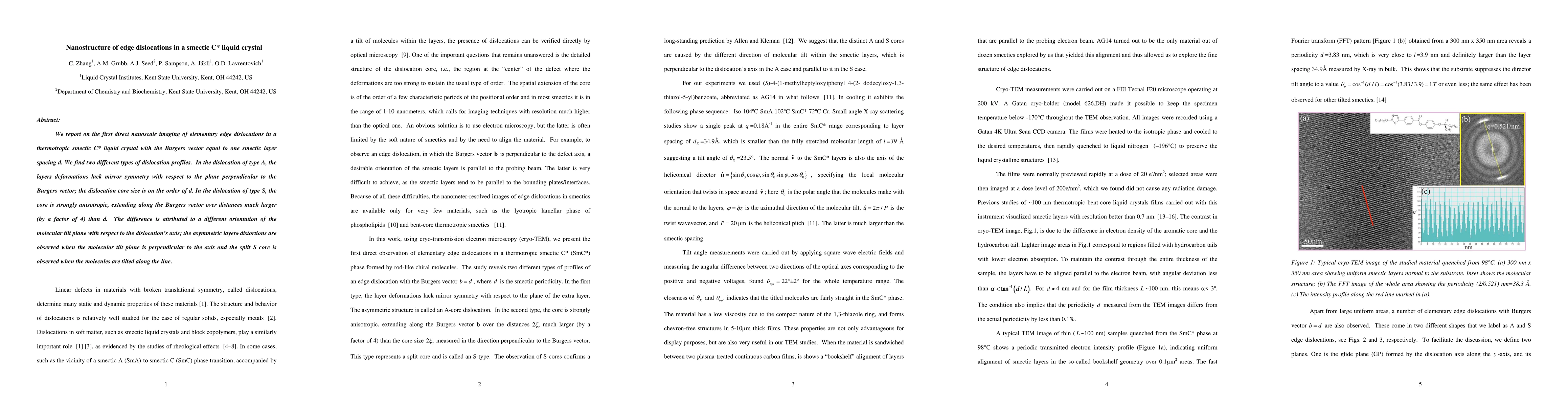 We report on the first direct nanoscale imaging of elementary edge dislocations in a thermotropic chiral smectic C liquid crystal with the Burgers vector equal to one smectic layer spacing d. We find two different types of dislocation profiles. In the dislocation of type A, the layers deformations lack mirror symmetry with respect to the plane perpendicular to the Burgers vector; the dislocation core size is on the order of d. In the dislocation of type S, the core is strongly anisotropic, extending along the Burgers vector over distances much larger (by a factor of 4) than d. The difference is attributed to a different orientation of the molecular tilt plane with respect to the dislocation axis; the asymmetric layers distortions are observed when the molecular tilt plane is perpendicular to the axis and the split S core is observed when the molecules are tilted along the line.