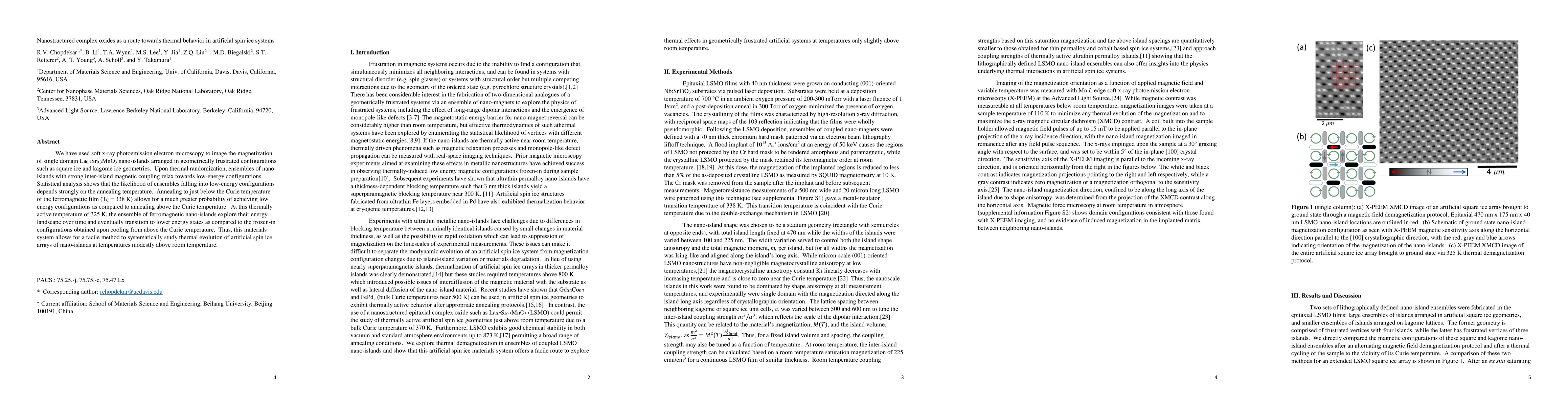We have used soft x-ray photoemission electron microscopy to image the magnetization of single domain La$_{0.7}$Sr$_{0.3}$MnO$_{3}$ nano-islands arranged in geometrically frustrated configurations such as square ice and kagome ice geometries. Upon thermal randomization, ensembles of nano-islands with strong inter-island magnetic coupling relax towards low-energy configurations. Statistical analysis shows that the likelihood of ensembles falling into low-energy configurations depends strongly on the annealing temperature. Annealing to just below the Curie temperature of the ferromagnetic film (T$_{C}$ = 338 K) allows for a much greater probability of achieving low energy configurations as compared to annealing above the Curie temperature. At this thermally active temperature of 325 K, the ensemble of ferromagnetic nano-islands explore their energy landscape over time and eventually transition to lower energy states as compared to the frozen-in configurations obtained upon cooling from above the Curie temperature. Thus, this materials system allows for a facile method to systematically study thermal evolution of artificial spin ice arrays of nano-islands at temperatures modestly above room temperature.