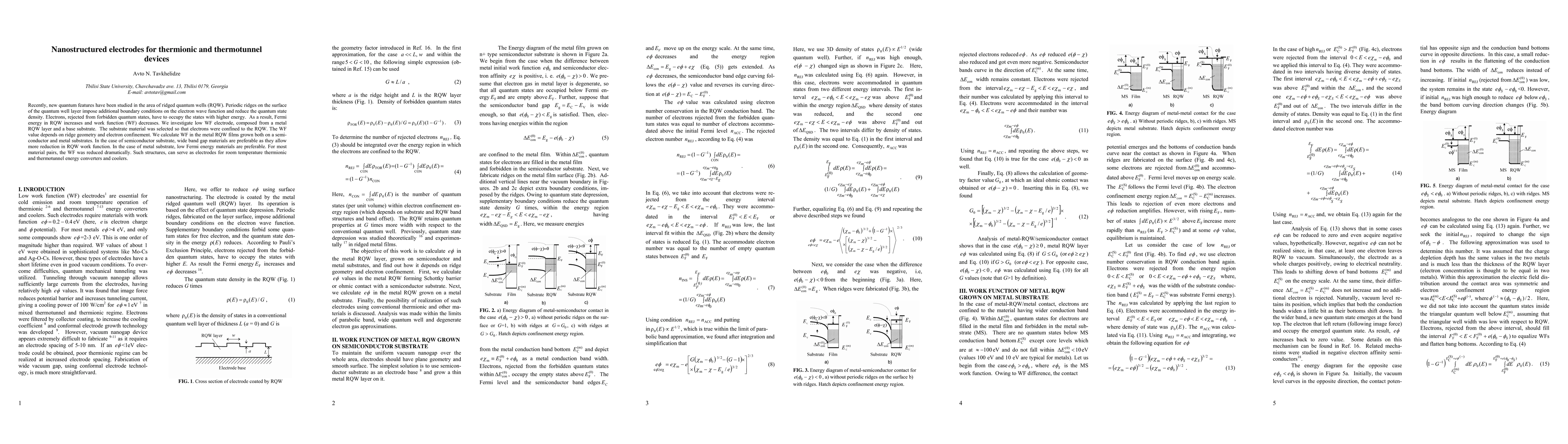 Recently, new quantum features have been studied in the area of ridged quantum wells (RQW). Periodic ridges on the surface of the quantum well layer impose additional boundary conditions on the electron wave function and reduce the quantum state density. Electrons, rejected from forbidden quantum states, have to occupy the states with higher energy. As a result, Fermi energy in RQW increases and work function (WF) decreases. We investigate low WF electrode, com-posed from a metal RQW layer and a base substrate. The substrate material was selected so that electrons were confined to the RQW. The WF value depends on ridge geometry and electron confinement. We calculate WF in the metal RQW films grown both on a semiconductor and metal substrates. In the case of semiconductor substrate, wide band gap materials are preferable as they allow more reduction in RQW work function. In the case of metal substrate, low Fermi energy materials are preferable. For most material pairs, the WF was reduced dramatically. Such structures, can serve as electrodes for room temperature thermionic and thermotunnel energy converters and coolers.