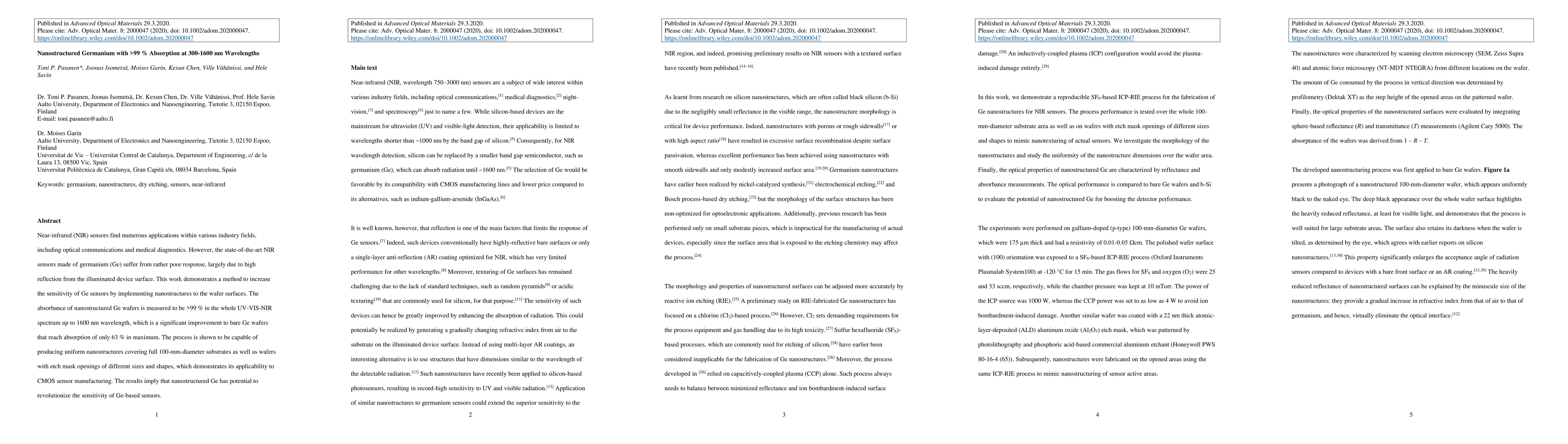 Near-infrared (NIR) sensors find numerous applications within various industry fields, including optical communications and medical diagnostics. However, the state-of-the-art NIR sensors made of germanium (Ge) suffer from rather poor response, largely due to high reflection from the illuminated device surface. We demonstrate here a method to increase the sensitivity of Ge sensors by implementing nanostructures to the wafer surfaces. The absorbance of nanostructured Ge wafers is measured to be >99 % in the whole UV-VIS-NIR spectrum up to 1600 nm wavelength, which is a significant improvement to bare Ge wafers that reach absorption of only 63 % in maximum. The process is shown to be capable of producing uniform nanostructures covering full 100-mm-diameter substrates as well as wafers with etch mask openings of different sizes and shapes, which demonstrates its applicability to CMOS sensor manufacturing. The results imply that nanostructured Ge has potential to revolutionize the sensitivity of Ge-based sensors.