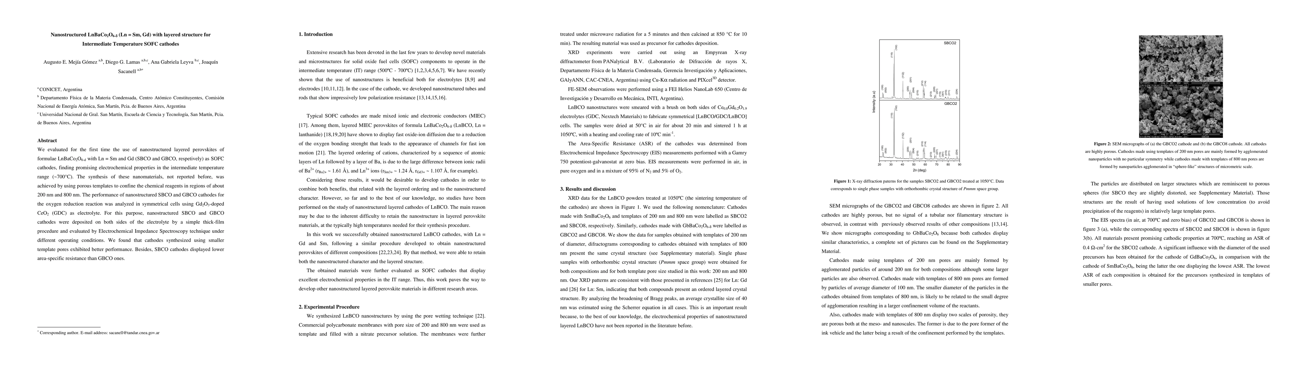 This study investigates the use of nanostructured layered perovskites LnBaCo2O6-d (Ln = Sm, Gd) as intermediate temperature SOFC cathodes, finding SBCO to exhibit better electrochemical performance than GBCO. The synthesis was achieved using porous templates, and the performance was evaluated using Electrochemical Impedance Spectroscopy.