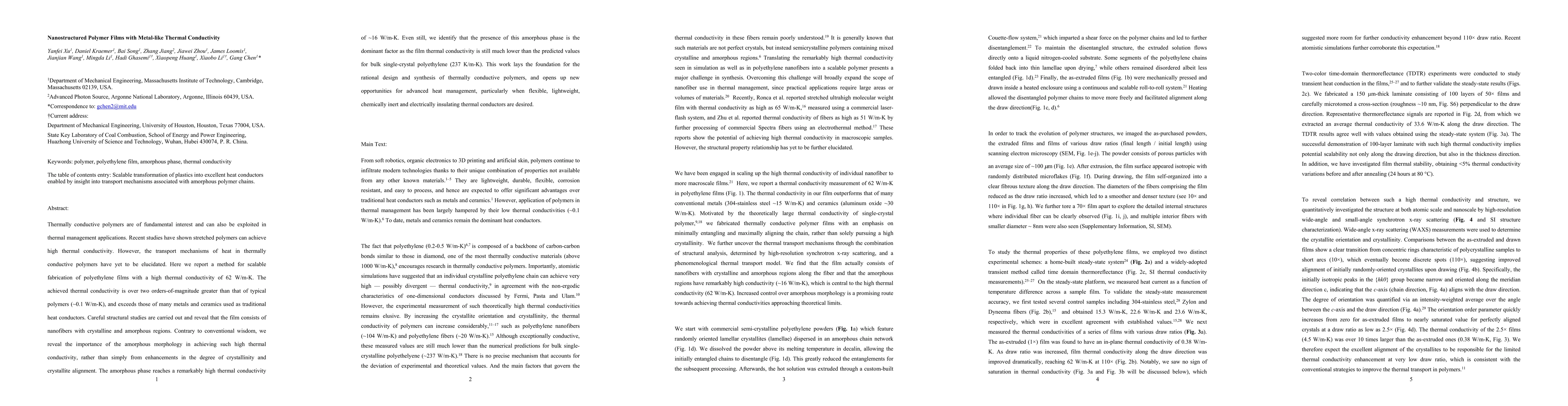 Thermally conductive polymers are of fundamental interest and can also be exploited in thermal management applications. Recent studies have shown stretched polymers can achieve high thermal conductivity. However, the transport mechanisms of heat in thermally conductive polymers have yet to be elucidated. Here we report a method for scalable fabrication of polyethylene films with a high thermal conductivity of 62 W/m-K. The achieved thermal conductivity is over two orders-of-magnitude greater than that of typical polymers (~0.1 W/m-K), and exceeds those of many metals and ceramics used as traditional heat conductors. Careful structural studies are carried out and reveal that the film consists of nanofibers with crystalline and amorphous regions. Contrary to conventional wisdom, we reveal the importance of the amorphous morphology in achieving such high thermal conductivity, rather than simply from enhancements in the degree of crystallinity and crystallite alignment. The amorphous phase reaches a remarkably high thermal conductivity of ~16 W/m-K. Even still, we identify that the presence of this amorphous phase is the dominant factor as the film thermal conductivity is still much lower than the predicted values for bulk single-crystal polyethylene (237 K/m-K). This work lays the foundation for the rational design and synthesis of thermally conductive polymers, and opens up new opportunities for advanced heat management, particularly when flexible, lightweight, chemically inert and electrically insulating thermal conductors are desired.
