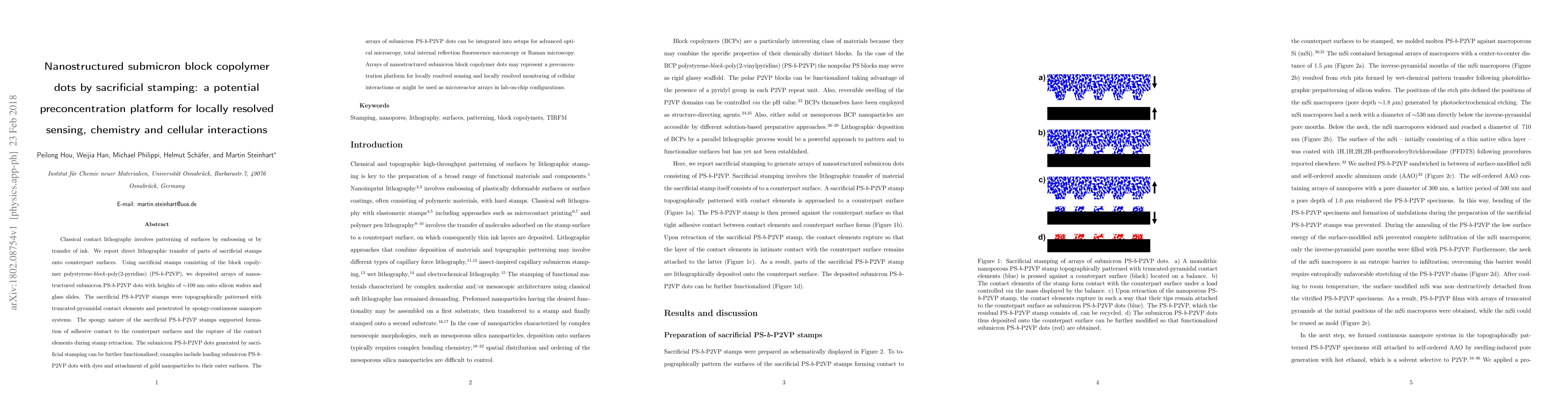 This paper describes a novel sacrificial stamping technique using block copolymer stamps to create arrays of nanostructured submicron dots on various surfaces. These dots can be functionalized for advanced microscopy applications and hold potential for preconcentration in sensing and cellular interaction studies.