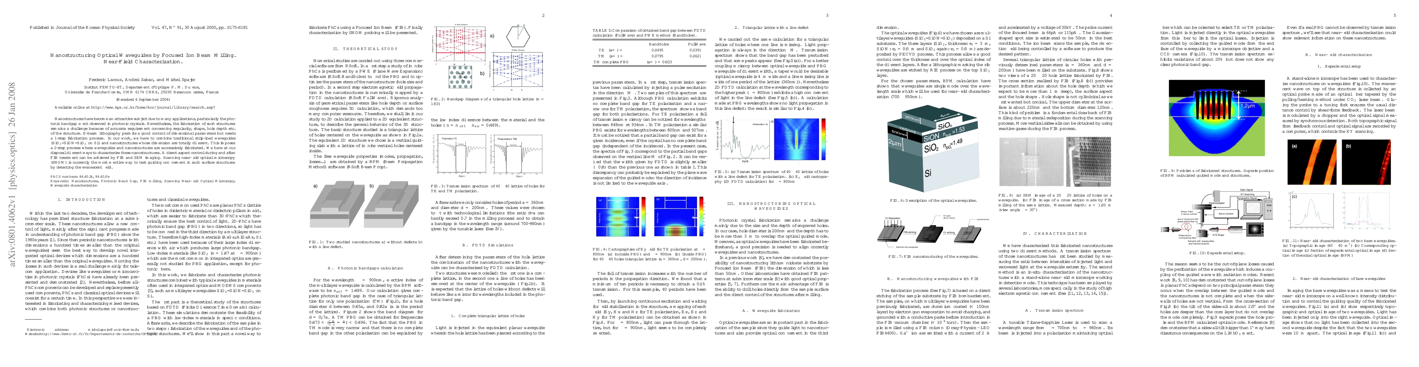 Nanostructures have become an attractive subject due to many applications, particularly the photonic bandgap effect observed in photonic crystals. Nevertheless, the fabrication of such structures remains a challenge because of accurate requirement concerning regularity, shape, hole depth etc. of the structure. E-beam lithography permits a good control of dimensional parameters but needs a 1-step fabrication process. In our work, we have to combine traditional strip-load waveguides (SiO2/SiON/SiO2 on Si) and nanostructures whose dimension are totally different. This imposes a 2-step process where waveguides and nanostructures are successively fabricated. We have at our disposal different ways to characterize these nanostructures. A direct aspect control during and after FIB treatment can be achieved by FIB and SEM imaging. Scanning near-field optical microscopy (SNOM) is currently the most effective way to test guiding confinement in such surface structures by detecting the evanescent field.