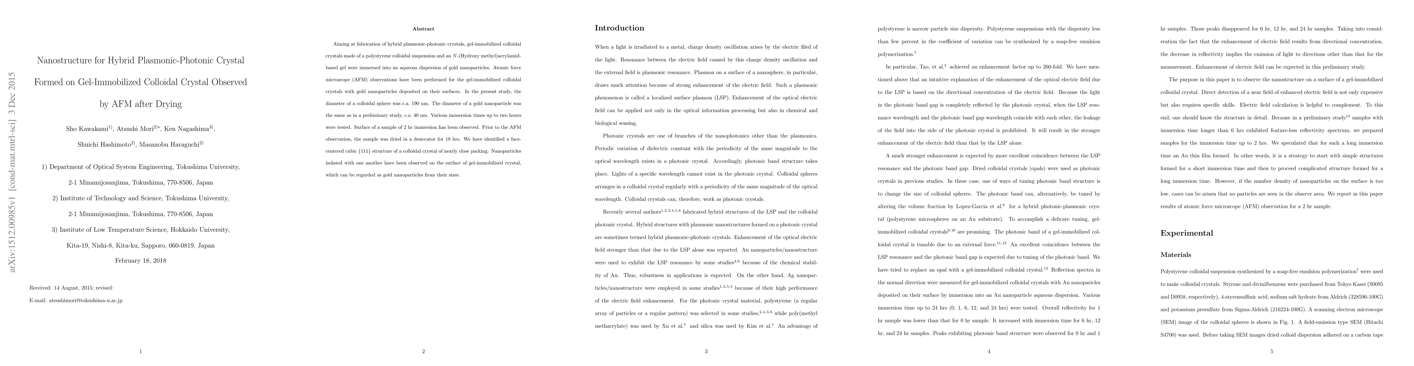 Aiming at fabrication of hybrid plasmonic-photonic crystals, gel-immobilized colloidal crystals made of a polystyrene colloidal suspension and an N-(Hydroxy methyl)acrylamid-based gel were immersed into an aqueous dispersion of gold nanoparticles. Atomic force microscope (AFM) observations have been performed for the gel-immobilized colloidal crystals with gold nanoparticles deposited on their surfaces. In the present study, the diameter of a colloidal sphere was c.a. 190 nm. The diameter of a gold nanoparticle was the same as in a preliminary study, c.a. 40 nm. Various immersion times up to two hours were tested. Surface of a sample of 2 hr immersion has been observed. Prior to the AFM observation, the sample was dried in a desiccator for 18 hrs. We have identified a face-centered cubic {111} structure of a colloidal crystal of nearly close packing. Nanoparticles isolated with one another have been observed on the surface of gel-immobilized crystal, which can be regarded as gold nanoparticles from their sizes.