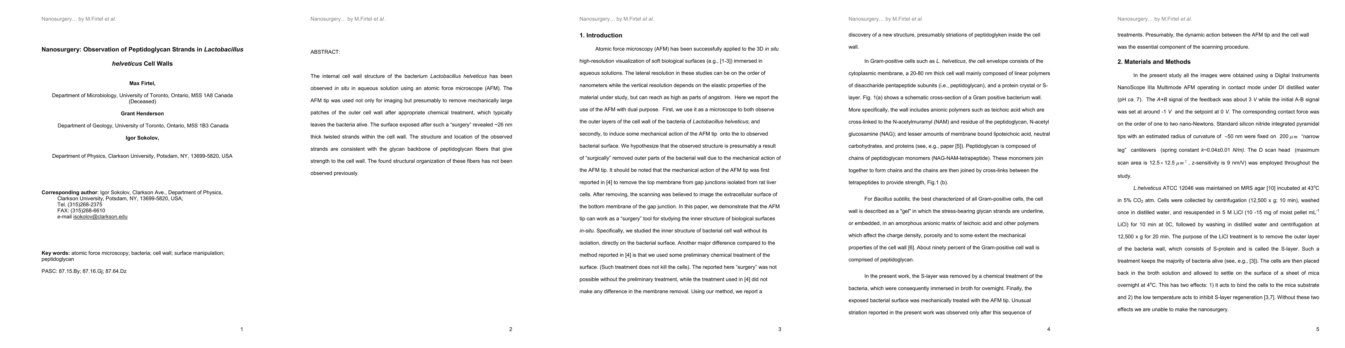 The internal cell wall structure of the bacterium Lactobacillus helveticus has been observed in situ in aqueous solution using an atomic force microscope (AFM). The AFM tip was used not only for imaging but presumably to remove mechanically large patches of the outer cell wall after appropriate chemical treatment, which typically leaves the bacteria alive. The surface exposed after such a surgery revealed ca. 26 nm thick twisted strands within the cell wall. The structure and location of the observed strands are consistent with the glycan backbone of peptidoglycan fibers that give strength to the cell wall. The found structural organization of these fibers has not been observed previously.