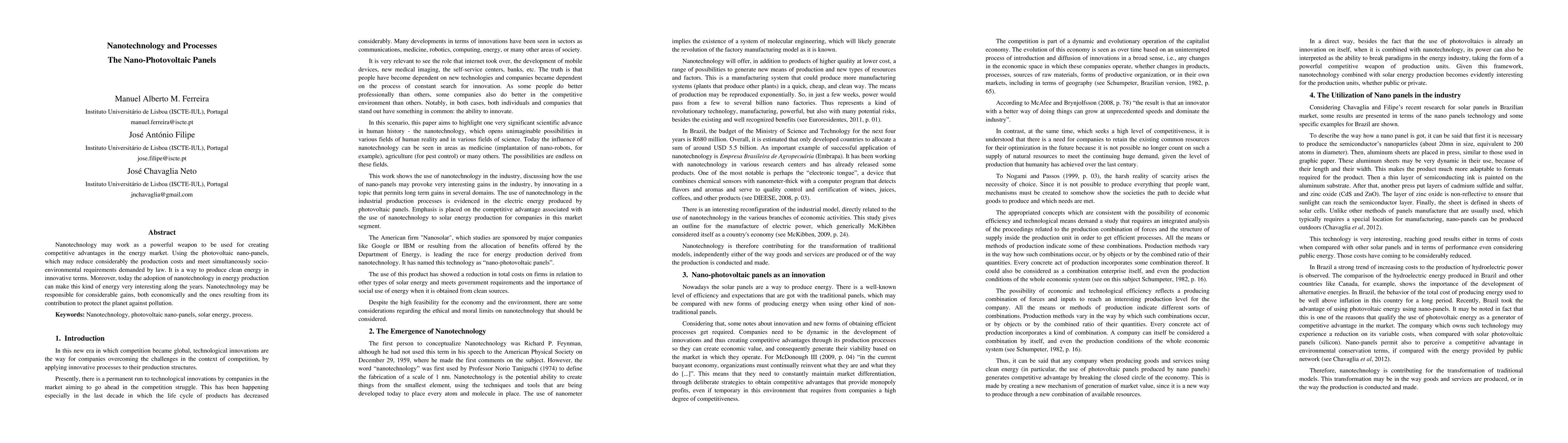 Nanotechnology may work as a powerful weapon to be used for creating competitive advantages in the energy market. Using the photovoltaic nano-panels, which may reduce considerably the production costs and meet simultaneously socio-environmental requirements demanded by law. It is a way to produce clean energy in innovative terms. Moreover, today the adoption of nanotechnology in energy production can make this kind of energy very interesting along the years. Nanotechnology may be responsible for considerable gains, both economically and the ones resulting from its contribution to protect the planet against pollution.