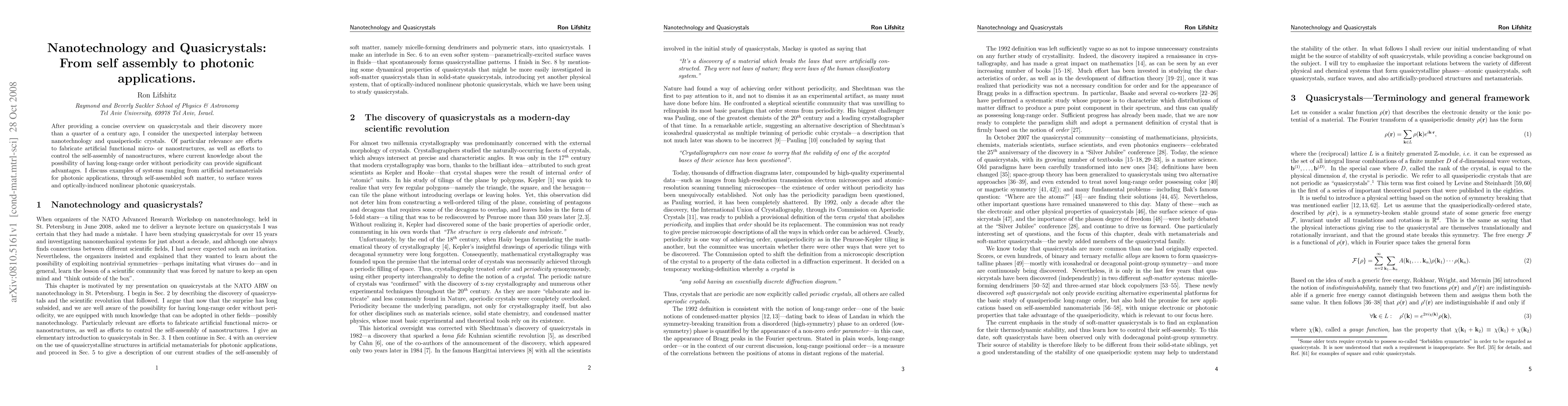 This paper explores the intersection of nanotechnology and quasicrystals, highlighting the potential of quasiperiodic structures in self-assembly and photonic applications. It examines various systems, from artificial metamaterials to nonlinear photonic quasicrystals, showcasing the advantages of long-range order without periodicity.
