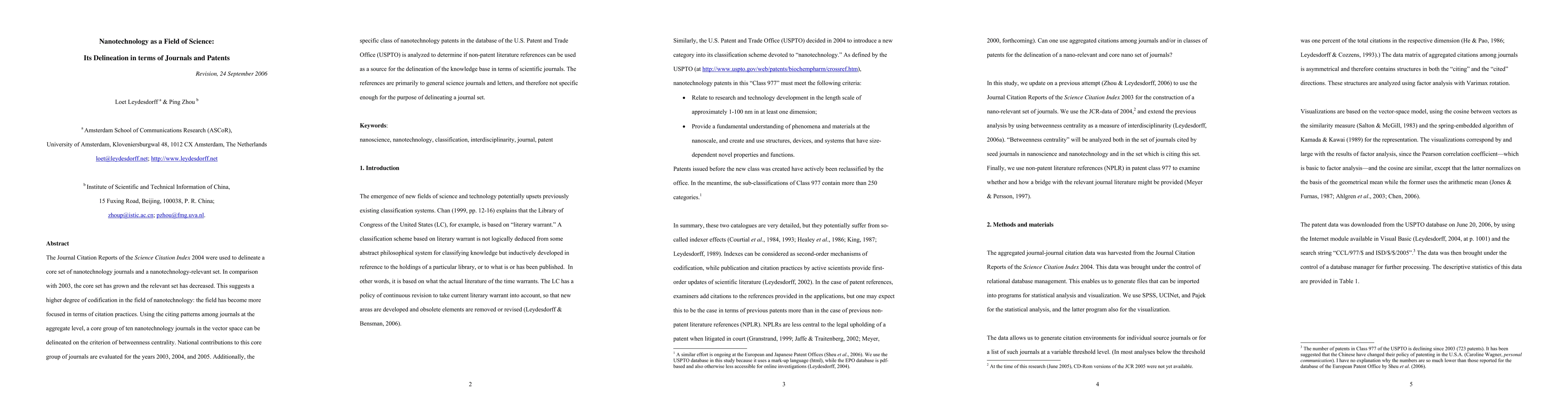 This paper delineates a core set of nanotechnology journals using 2004 Journal Citation Reports and identifies a growing focus in citation practices. It also evaluates national contributions to these journals and analyzes USPTO patents, finding non-patent literature references insufficient for journal set delineation.