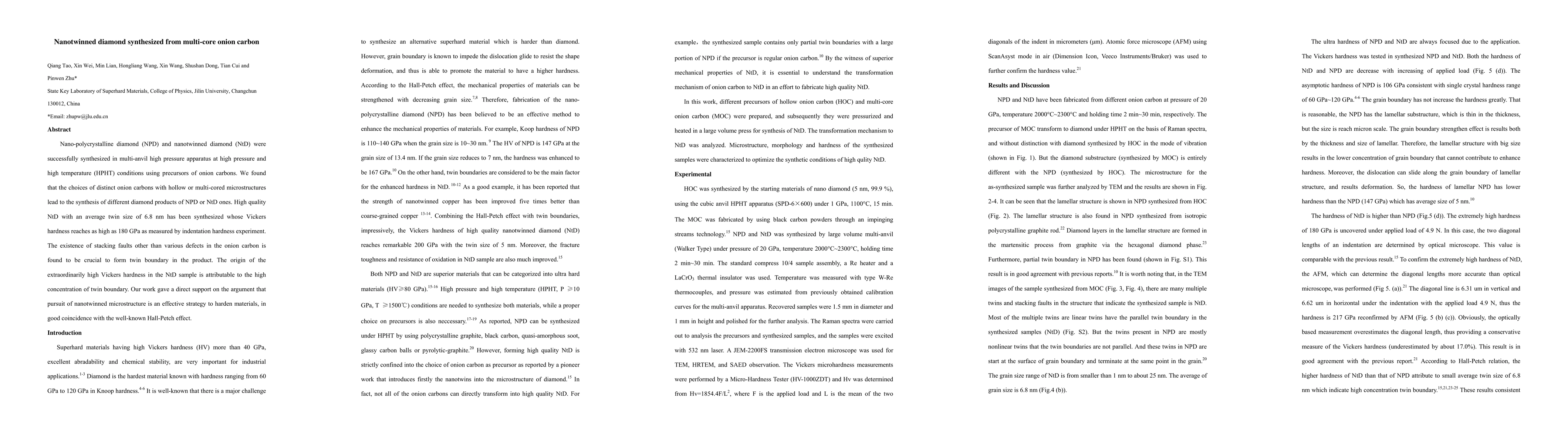 This paper reports the synthesis of nanotwinned diamond (NtD) from multi-core onion carbons under high pressure and temperature conditions, resulting in a Vickers hardness of 180 GPa. The study highlights that the microstructure of the onion carbon precursor, particularly the presence of stacking faults, is crucial for forming the NtD's high-density twin boundaries, which contribute to its extraordinary hardness.