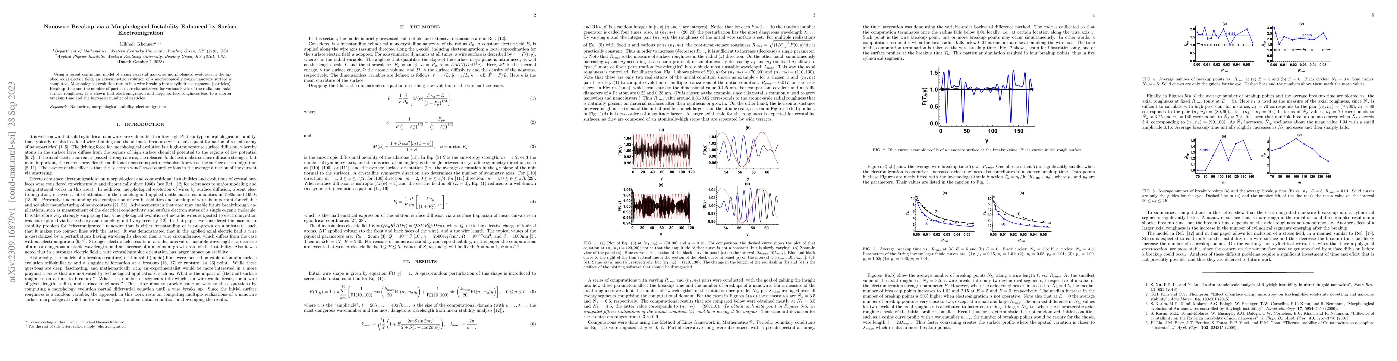 This research investigates the breakup of single-crystal nanowires under axial electric fields, revealing that morphological instability, enhanced by surface electromigration and increased roughness, leads to quicker wire fragmentation into cylindrical segments. The study quantifies the breakup time and particle count as functions of surface roughness levels.