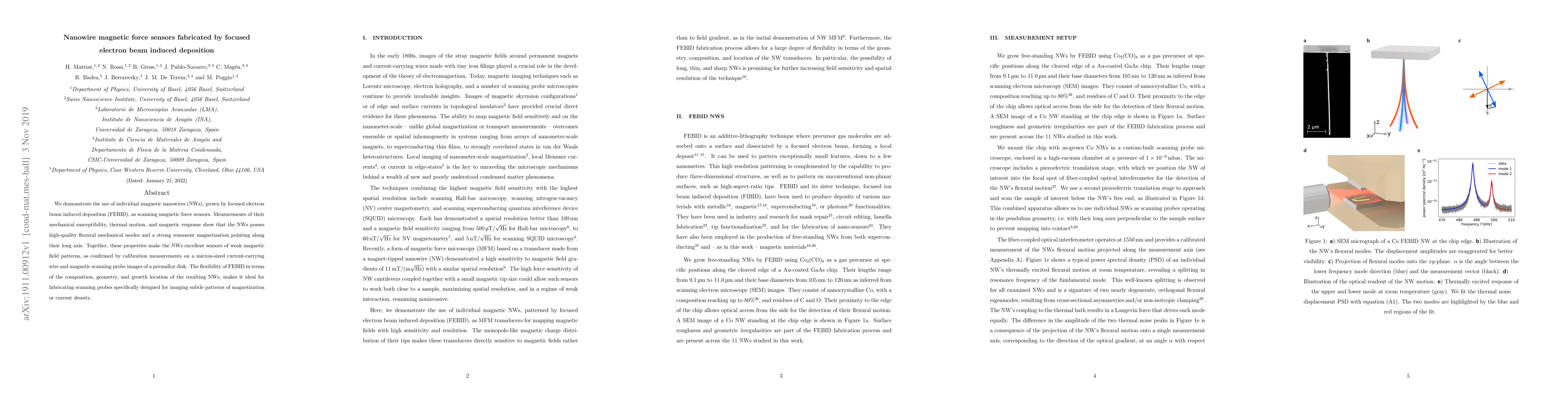 This paper demonstrates the fabrication of high-quality magnetic nanowire sensors using focused electron beam induced deposition, showcasing their strong remanent magnetization and mechanical properties, which enable them to accurately detect weak magnetic field patterns. The technique's flexibility allows for precise control over the nanowire's composition and geometry, making it suitable for imaging magnetic and current density patterns.