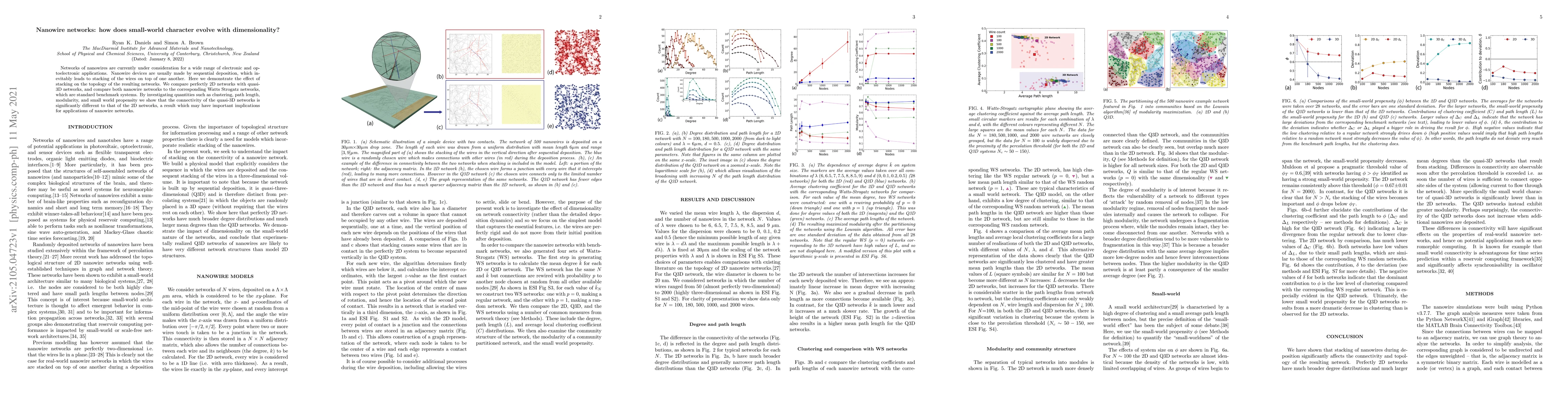 Networks of nanowires are currently under consideration for a wide range of electronic and optoelectronic applications. Nanowire devices are usually made by sequential deposition, which inevitably leads to stacking of the wires on top of one another. Here we demonstrate the effect of stacking on the topology of the resulting networks. We compare perfectly 2D networks with quasi3D networks, and compare both nanowire networks to the corresponding Watts Strogatz networks, which are standard benchmark systems. By investigating quantities such as clustering, path length, modularity, and small world propensity we show that the connectivity of the quasi-3D networks is significantly different to that of the 2D networks, a result which may have important implications for applications of nanowire networks.