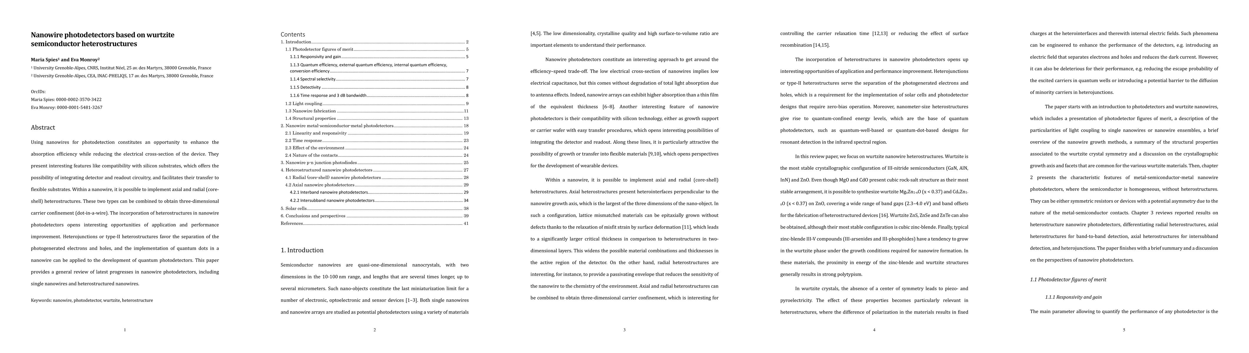 The paper presents a comprehensive review of nanowire photodetectors based on wurtzite semiconductor heterostructures, discussing various architectures, advantages, and challenges, along with recent progress in single nanowires and heterostructured nanowires.