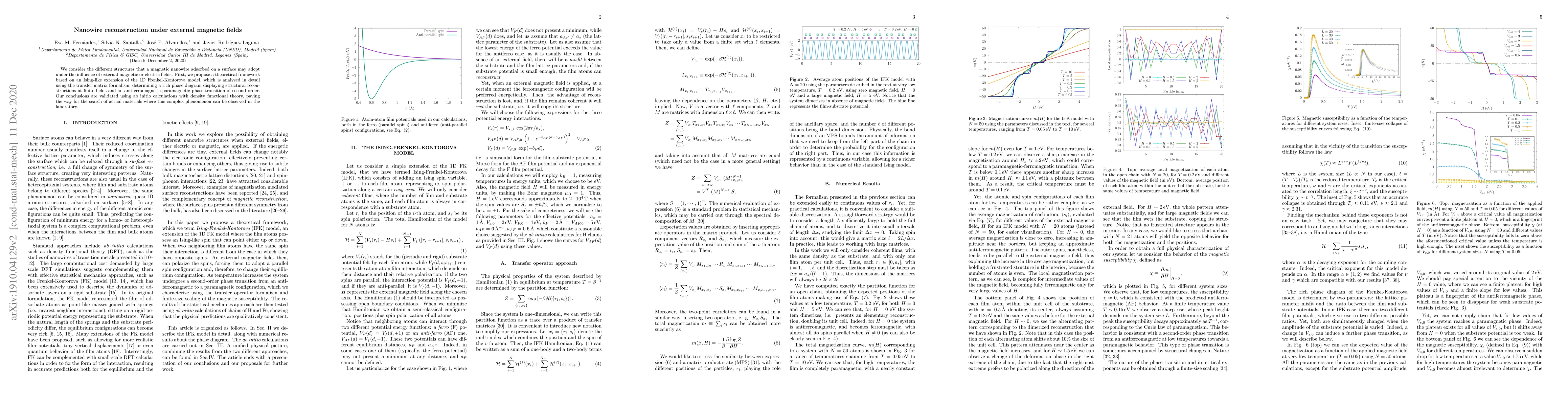 We consider the different structures that a magnetic nanowire adsorbed on a surface may adopt under the influence of external magnetic or electric fields. First, we propose a theoretical framework based on an Ising-like extension of the 1D Frenkel-Kontorova model, which is analysed in detail using the transfer matrix formalism, determining a rich phase diagram displaying structural reconstructions at finite fields and an antiferromagnetic-paramagnetic phase transition of second order. Our conclusions are validated using ab initio calculations with density functional theory, paving the way for the search of actual materials where this complex phenomenon can be observed in the laboratory.