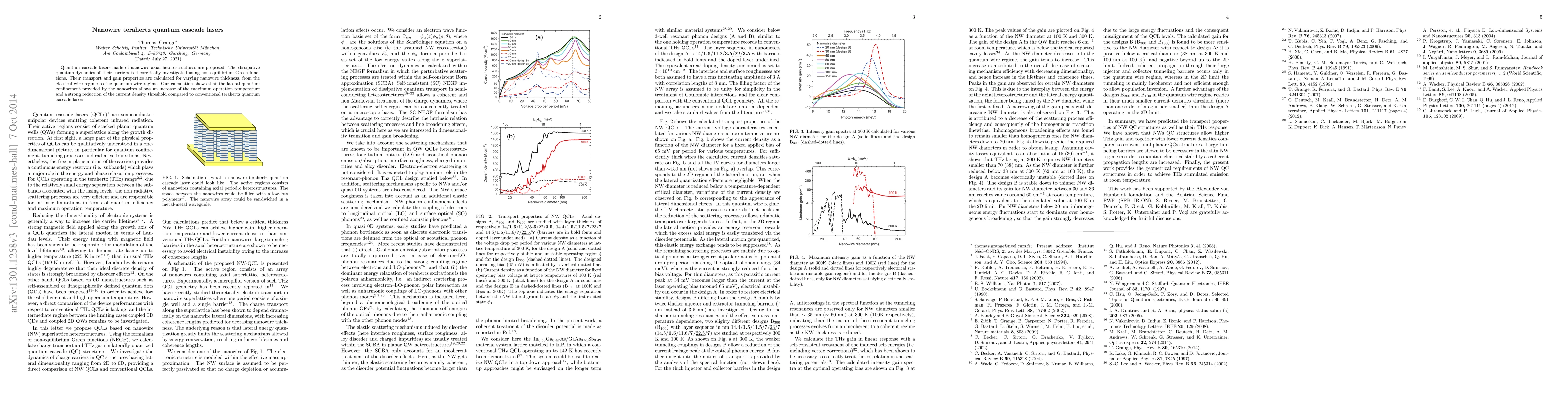 Quantum cascade lasers made of nanowire axial heterostructures are proposed. The dissipative quantum dynamics of their carriers is theoretically investigated using non-equilibrium Green functions. Their transport and gain properties are calculated for varying nanowire thickness, from the classical-wire regime to the quantum-wire regime. Our calculation shows that the lateral quantum confinement provided by the nanowires allows an increase of the maximum operation temperature and a strong reduction of the current density threshold compared to conventional terahertz quantum cascade lasers.