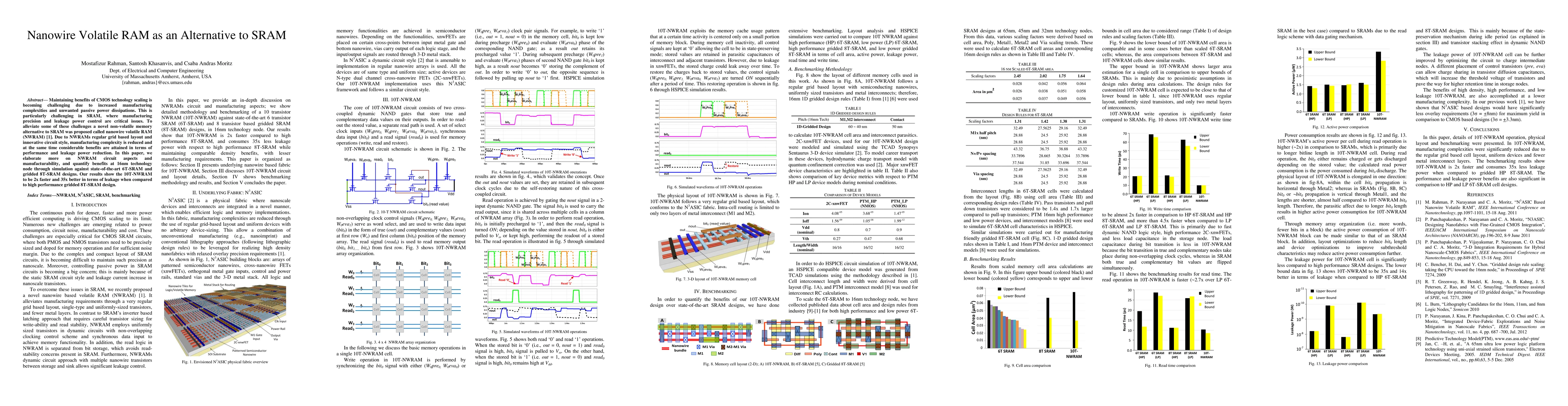Maintaining benefits of CMOS technology scaling is becoming challenging due to increased manufacturing complexities and unwanted passive power dissipations. This is particularly challenging in SRAM, where manufacturing precision and leakage power control are critical issues. To alleviate some of these challenges a novel non-volatile memory alternative to SRAM was proposed called nanowire volatile RAM (NWRAM). Due to NWRAMs regular grid based layout and innovative circuit style, manufacturing complexity is reduced and at the same time considerable benefits are attained in terms of performance and leakage power reduction. In this paper, we elaborate more on NWRAM circuit aspects and manufacturability, and quantify benefits at 16nm technology node through simulation against state-of-the-art 6T-SRAM and gridded 8T-SRAM designs. Our results show the 10T-NWRAM to be 2x faster and 35x better in terms of leakage when compared to high performance gridded 8T-SRAM design.