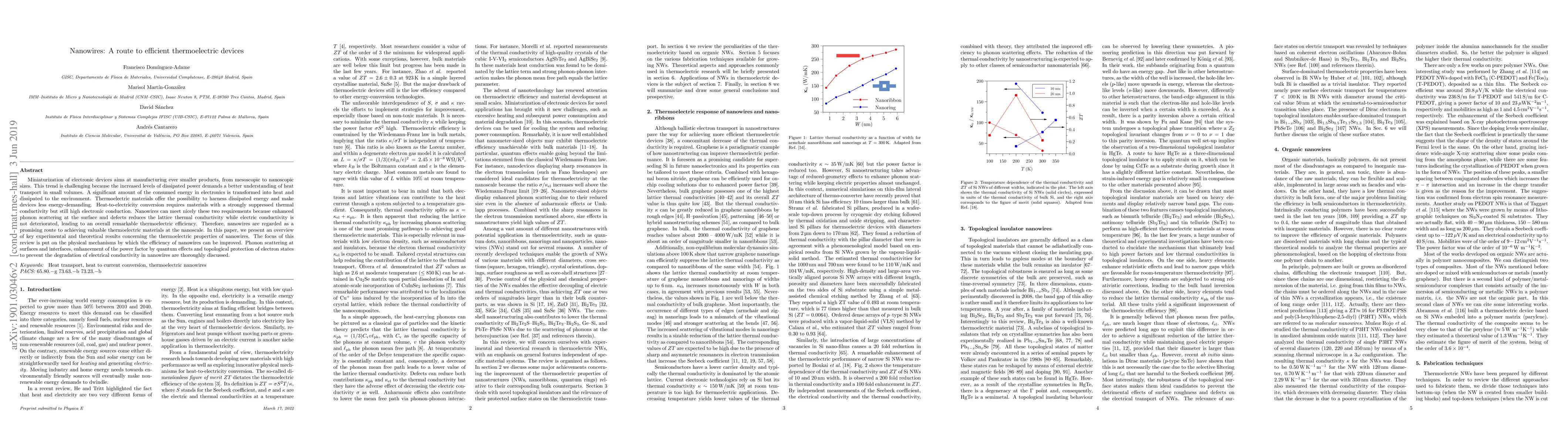 This paper reviews nanowires as promising materials for efficient thermoelectric devices, emphasizing how surface and interface phonon scattering reduces thermal conductivity while maintaining high electrical conductivity. The focus is on mechanisms like quantum effects and topological protection to enhance thermoelectric efficiency.
