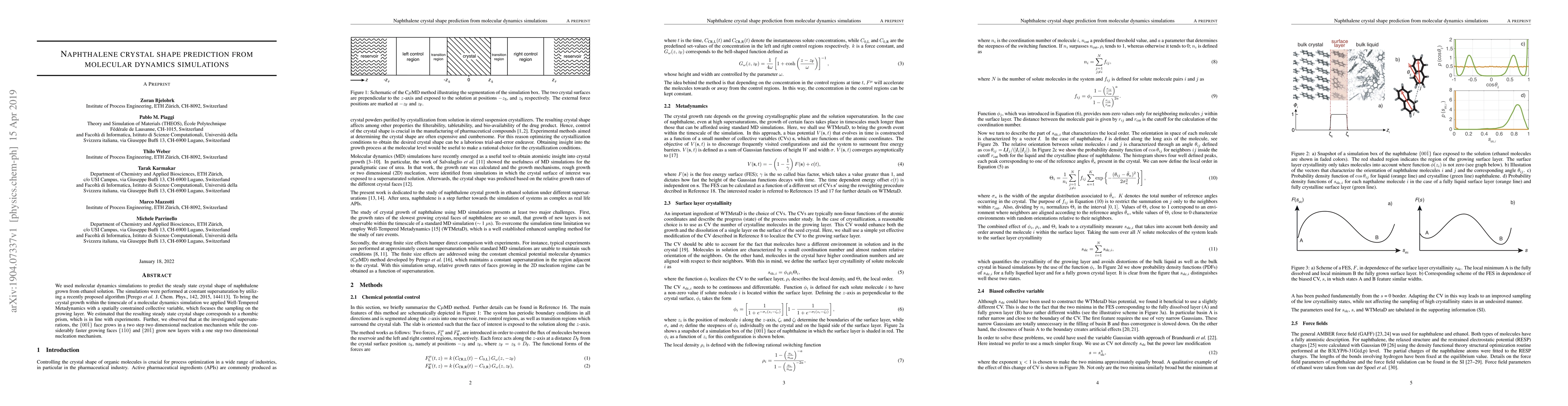 This study uses molecular dynamics simulations to predict the steady state crystal shape of naphthalene from ethanol solution, revealing a rhombic prism shape consistent with experimental observations. The simulations employed Well-Tempered Metadynamics to focus on the growing layer, identifying different nucleation mechanisms for different crystal faces.