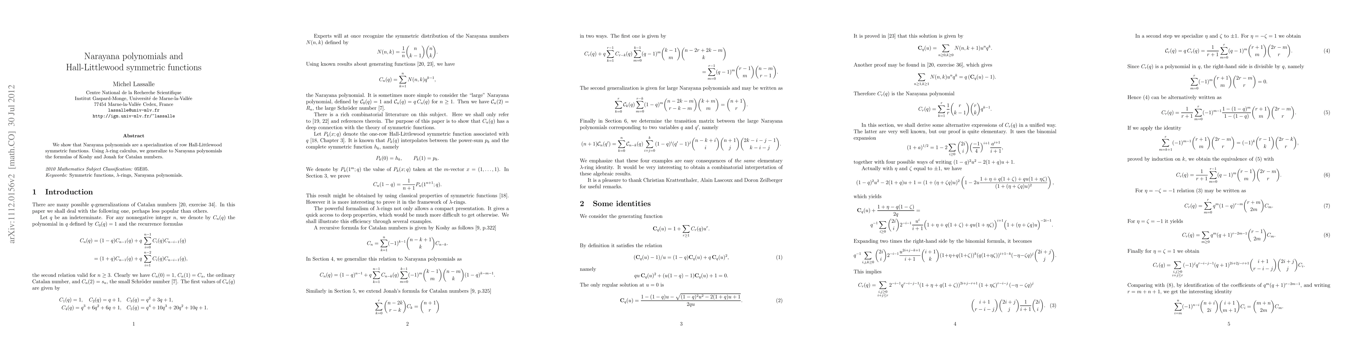 We show that Narayana polynomials are a specialization of row Hall-Littlewood symmetric functions. Using lambda-ring calculus, we generalize to Narayana polynomials the formulas of Koshy and Jonah for Catalan numbers.