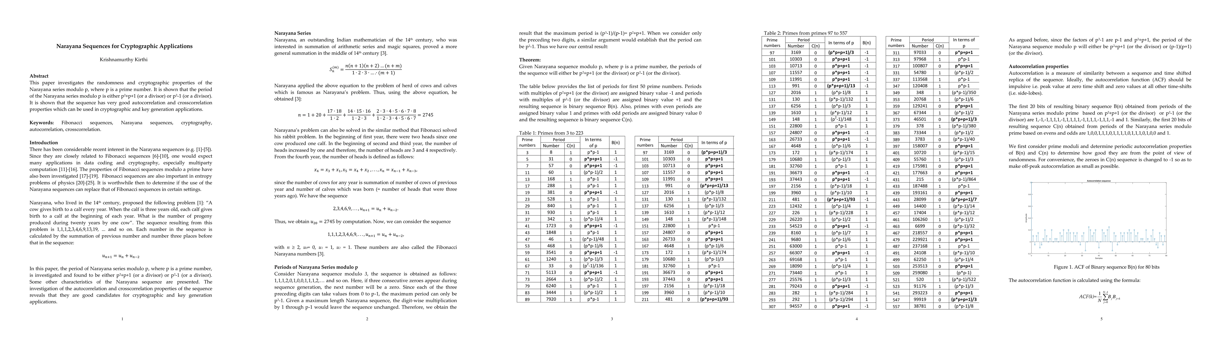 This paper investigates the randomness and cryptographic properties of the Narayana series modulo p, where p is a prime number. It is shown that the period of the Narayana series modulo p is either p*p+p+1 (or a divisor) or p*p-1 (or a divisor). It is shown that the sequence has very good autocorrelation and crosscorrelation properties which can be used in cryptographic and key generation applications.