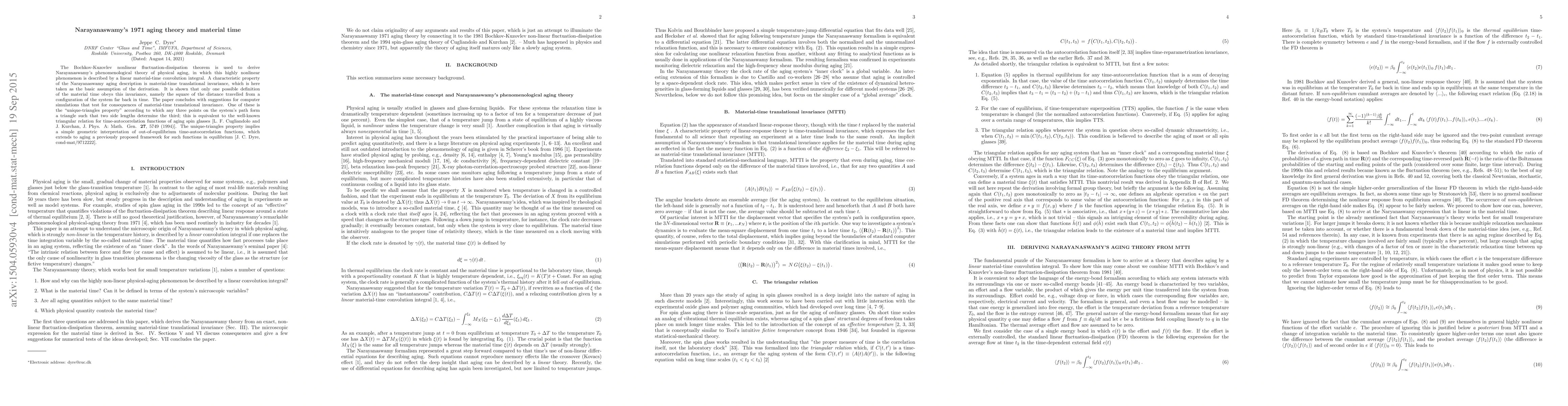 The Bochkov-Kuzovlev nonlinear fluctuation-dissipation theorem is used to derive Narayanaswamy's phenomenological theory of physical aging, in which this highly nonlinear phenomenon is described by a linear material-time convolution integral. A characteristic property of the Narayanaswamy aging description is material-time translational invariance, which is here taken as the basic assumption of the derivation. It is shown that only one possible definition of the material time obeys this invariance, namely the square of the distance travelled from a configuration of the system far back in time. The paper concludes with suggestions for computer simulations that test for consequences of material-time translational invariance. One of these is the "unique-triangles property" according to which any three points on the system's path form a triangle such that two side lengths determine the third; this is equivalent to the well-known triangular relation for time-autocorrelation functions of aging spin glasses [L. F. Cugliandolo and J. Kurchan, J. Phys. A: Math. Gen. 27, 5749 (1994)]. The unique-triangles property implies a simple geometric interpretation of out-of-equilibrium time-autocorrelation functions, which extends to aging a previously proposed framework for such functions in equilibrium [J. C. Dyre, cond-mat/9712222].