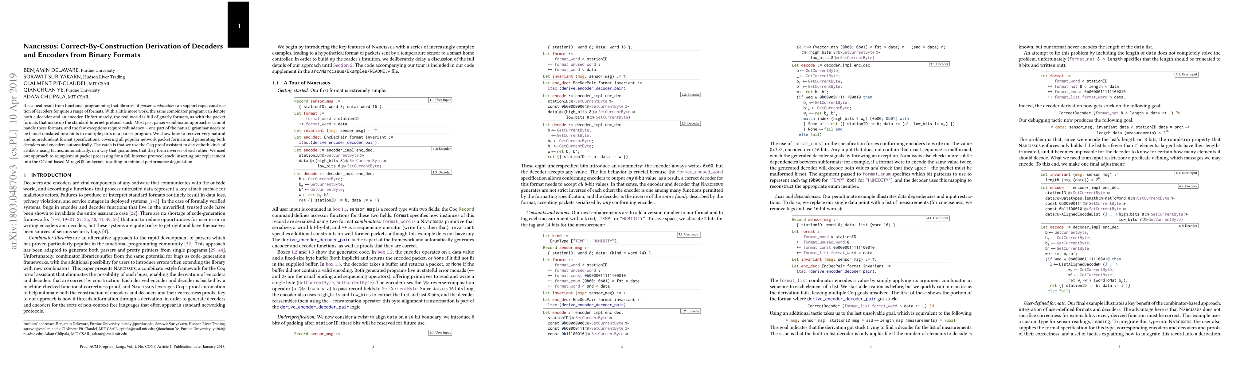 It is a neat result from functional programming that libraries of parser combinators can support rapid construction of decoders for quite a range of formats. With a little more work, the same combinator program can denote both a decoder and an encoder. Unfortunately, the real world is full of gnarly formats, as with the packet formats that make up the standard Internet protocol stack. Most past parser-combinator approaches cannot handle these formats, and the few exceptions require redundancy -- one part of the natural grammar needs to be hand-translated into hints in multiple parts of a parser program. We show how to recover very natural and nonredundant format specifications, covering all popular network packet formats and generating both decoders and encoders automatically. The catch is that we use the Coq proof assistant to derive both kinds of artifacts using tactics, automatically, in a way that guarantees that they form inverses of each other. We used our approach to reimplement packet processing for a full Internet protocol stack, inserting our replacement into the OCaml-based MirageOS unikernel, resulting in minimal performance degradation.