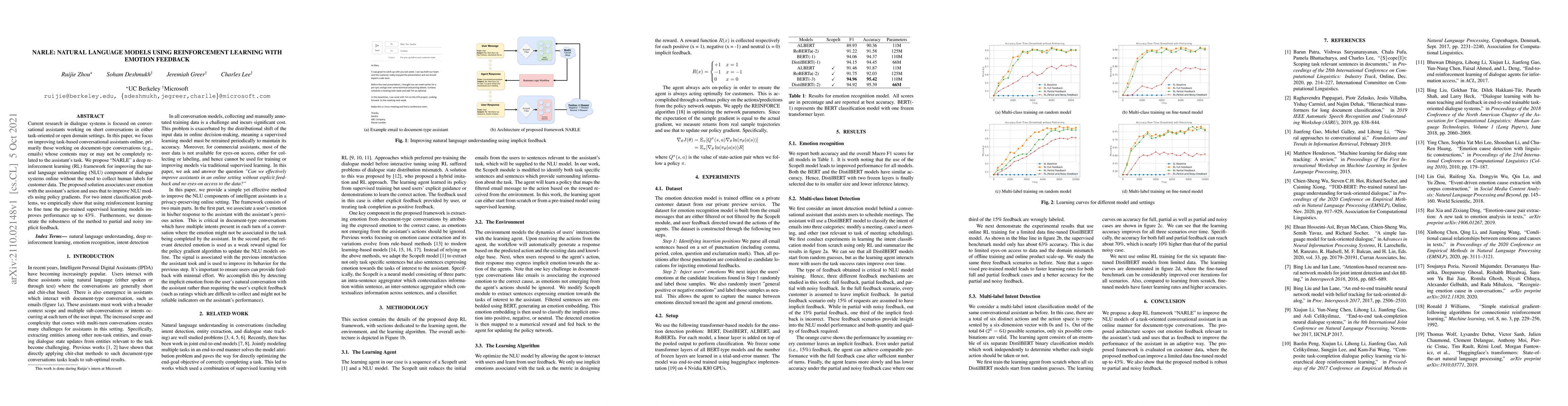 Summary: This paper introduces "NARLE," a reinforcement learning framework that enhances task-based conversational assistants by improving natural language understanding through policy gradients, leveraging user emotion without requiring human-labeled data. Empirical results show up to a 43% performance improvement in intent classification and demonstrate the method's robustness to partial and noisy feedback.