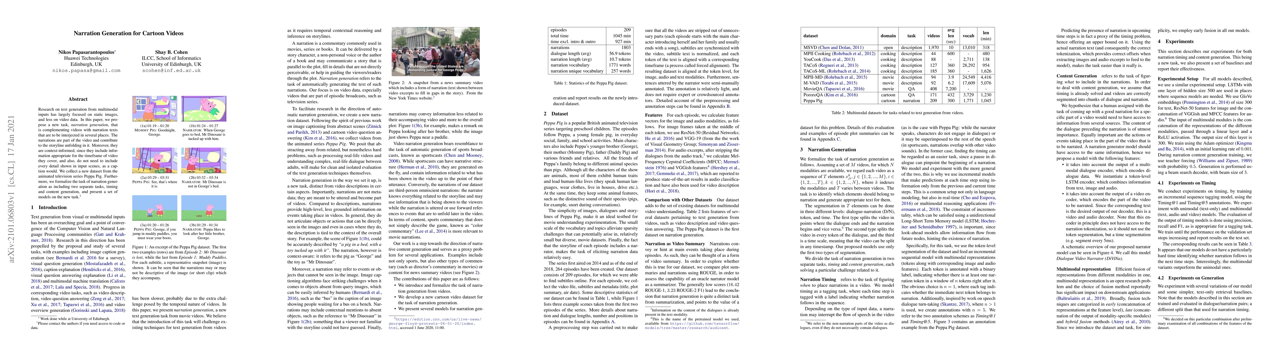 This paper introduces a new task of narration generation for cartoon videos, aiming to create context-informed narration texts that complement and enhance the storyline. The authors propose a dataset from Peppa Pig and present models for timing and content generation of these narrations.