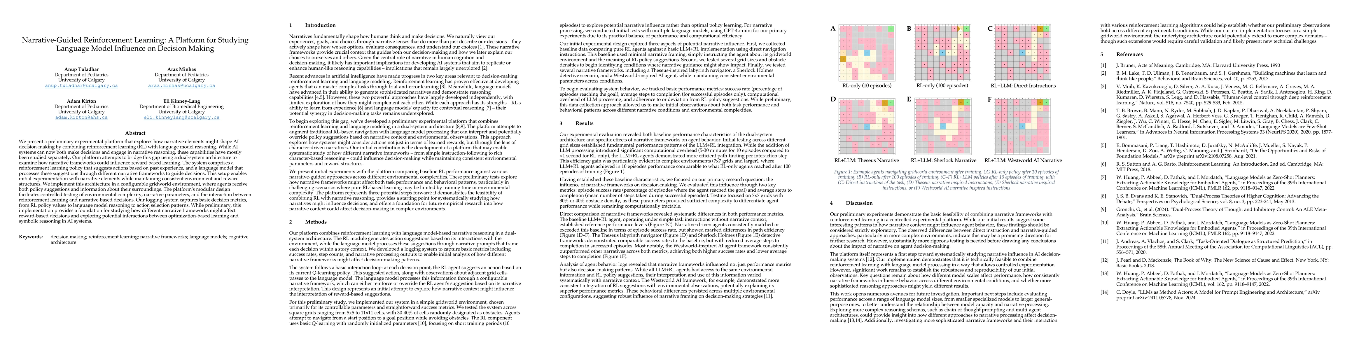 We present a preliminary experimental platform that explores how narrative elements might shape AI decision-making by combining reinforcement learning (RL) with language model reasoning. While AI systems can now both make decisions and engage in narrative reasoning, these capabilities have mostly been studied separately. Our platform attempts to bridge this gap using a dual-system architecture to examine how narrative frameworks could influence reward-based learning. The system comprises a reinforcement learning policy that suggests actions based on past experience, and a language model that processes these suggestions through different narrative frameworks to guide decisions. This setup enables initial experimentation with narrative elements while maintaining consistent environment and reward structures. We implement this architecture in a configurable gridworld environment, where agents receive both policy suggestions and information about their surroundings. The platform's modular design facilitates controlled testing of environmental complexity, narrative parameters, and the interaction between reinforcement learning and narrative-based decisions. Our logging system captures basic decision metrics, from RL policy values to language model reasoning to action selection patterns. While preliminary, this implementation provides a foundation for studying how different narrative frameworks might affect reward-based decisions and exploring potential interactions between optimization-based learning and symbolic reasoning in AI systems.