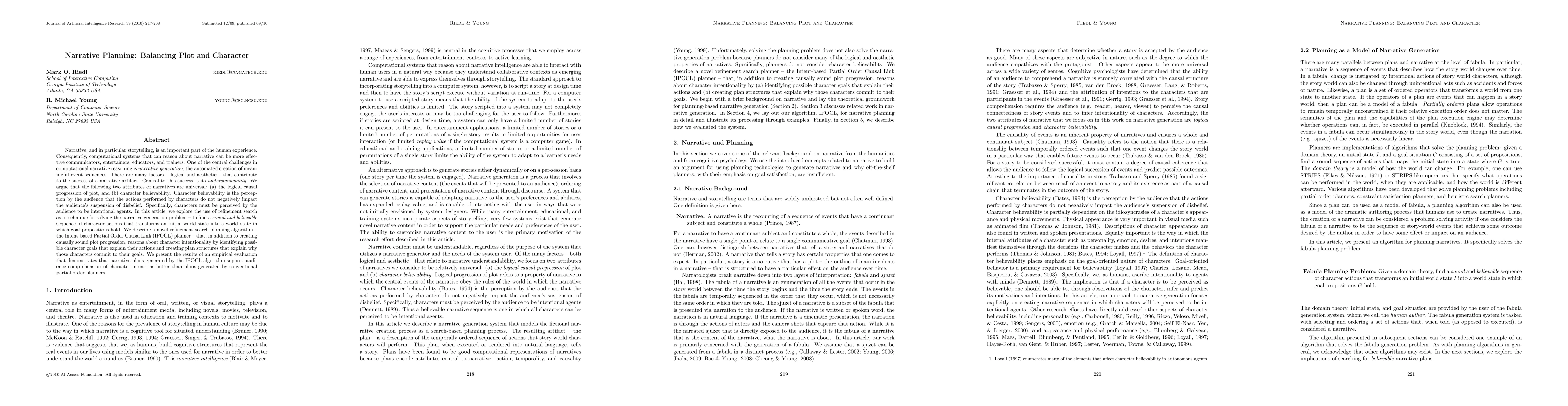 This paper explores narrative generation using refinement search to create meaningful event sequences that balance logical plot progression and character believability. The proposed Intent-based Partial Order Causal Link (IPOCL) planner enhances comprehension by identifying character goals and actions that maintain audience suspension of disbelief. Empirical results show that IPOCL plans outperform conventional planners in supporting audience understanding of character intentions.