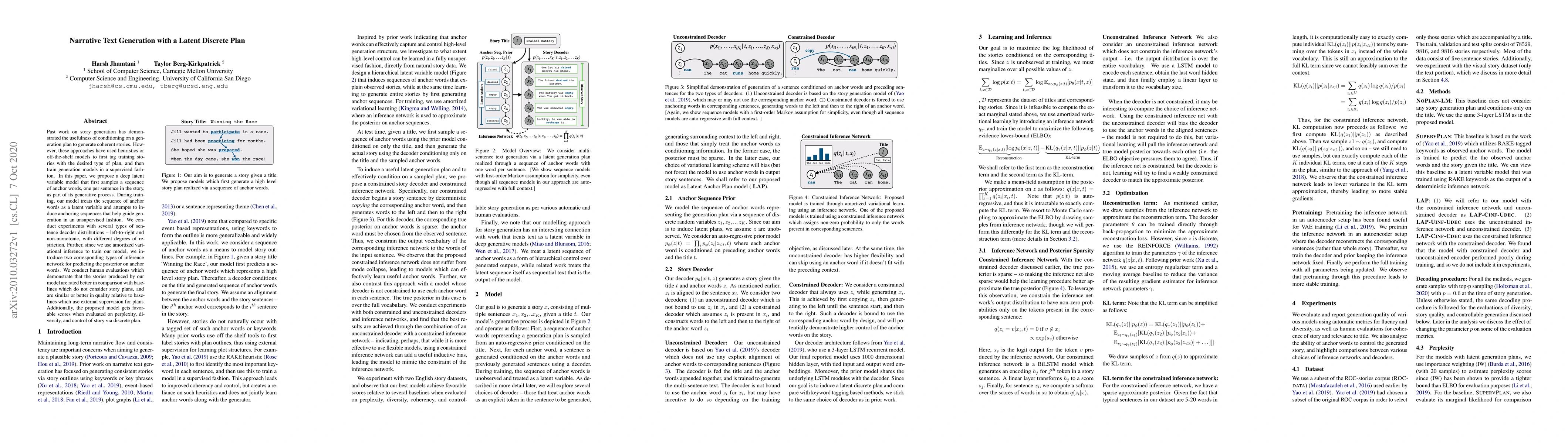 This paper introduces a deep latent variable model for generating narrative text that samples a sequence of anchor words to guide story generation in an unsupervised manner. The model uses amortized variational inference and achieves better story coherence and quality compared to supervised baselines, as shown by human evaluations and metrics like perplexity and diversity.