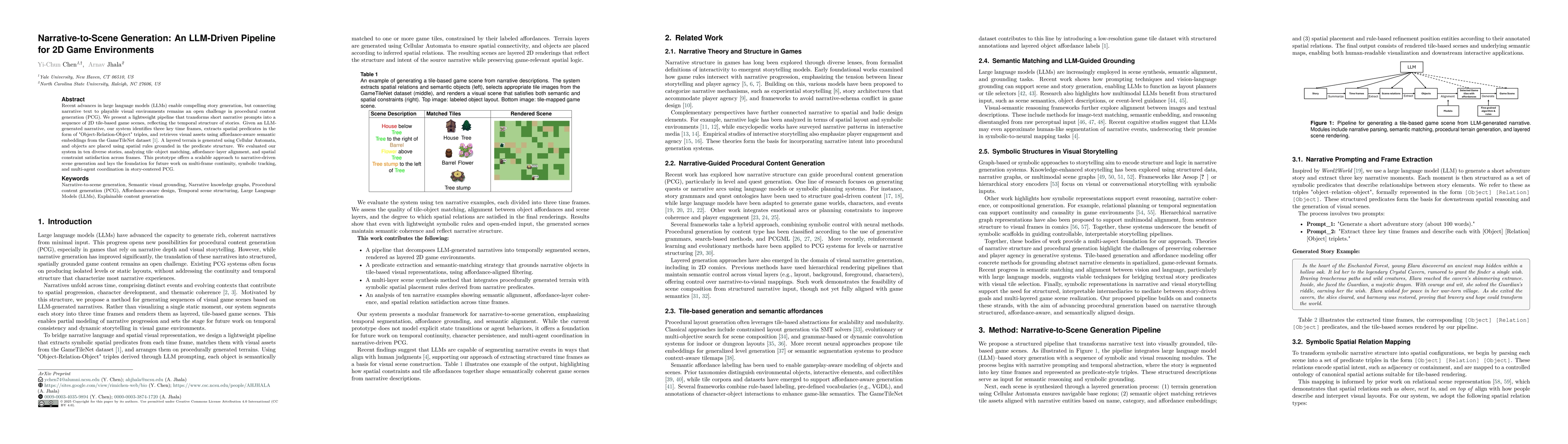 Recent advances in large language models(LLMs) enable compelling story generation, but connecting narrative text to playable visual environments remains an open challenge in procedural content generation(PCG). We present a lightweight pipeline that transforms short narrative prompts into a sequence of 2D tile-based game scenes, reflecting the temporal structure of stories. Given an LLM-generated narrative, our system identifies three key time frames, extracts spatial predicates in the form of "Object-Relation-Object" triples, and retrieves visual assets using affordance-aware semantic embeddings from the GameTileNet dataset. A layered terrain is generated using Cellular Automata, and objects are placed using spatial rules grounded in the predicate structure. We evaluated our system in ten diverse stories, analyzing tile-object matching, affordance-layer alignment, and spatial constraint satisfaction across frames. This prototype offers a scalable approach to narrative-driven scene generation and lays the foundation for future work on multi-frame continuity, symbolic tracking, and multi-agent coordination in story-centered PCG.