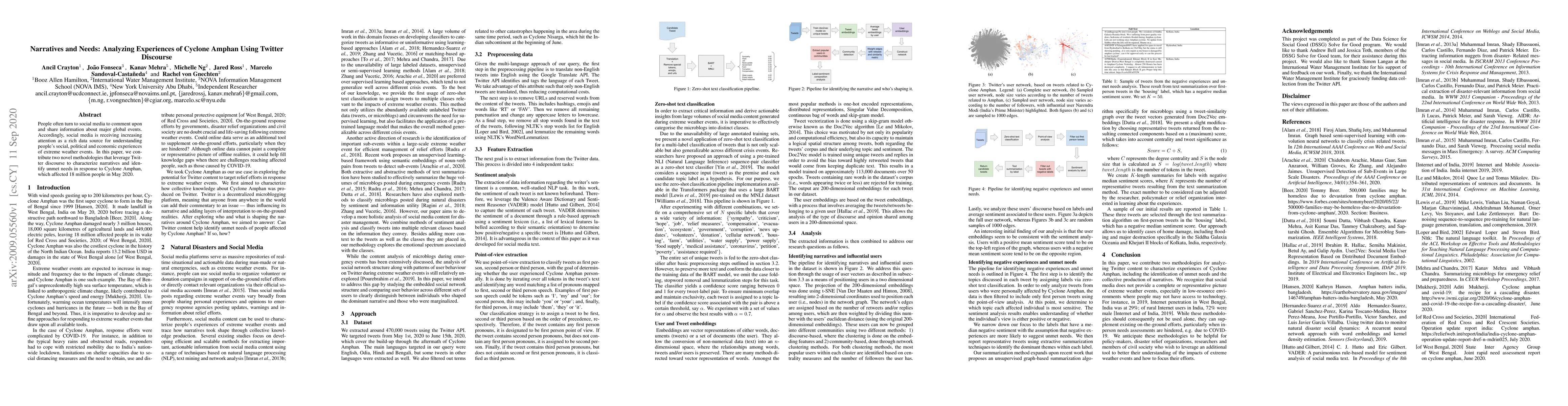 People often turn to social media to comment upon and share information about major global events. Accordingly, social media is receiving increasing attention as a rich data source for understanding people's social, political and economic experiences of extreme weather events. In this paper, we contribute two novel methodologies that leverage Twitter discourse to characterize narratives and identify unmet needs in response to Cyclone Amphan, which affected 18 million people in May 2020.