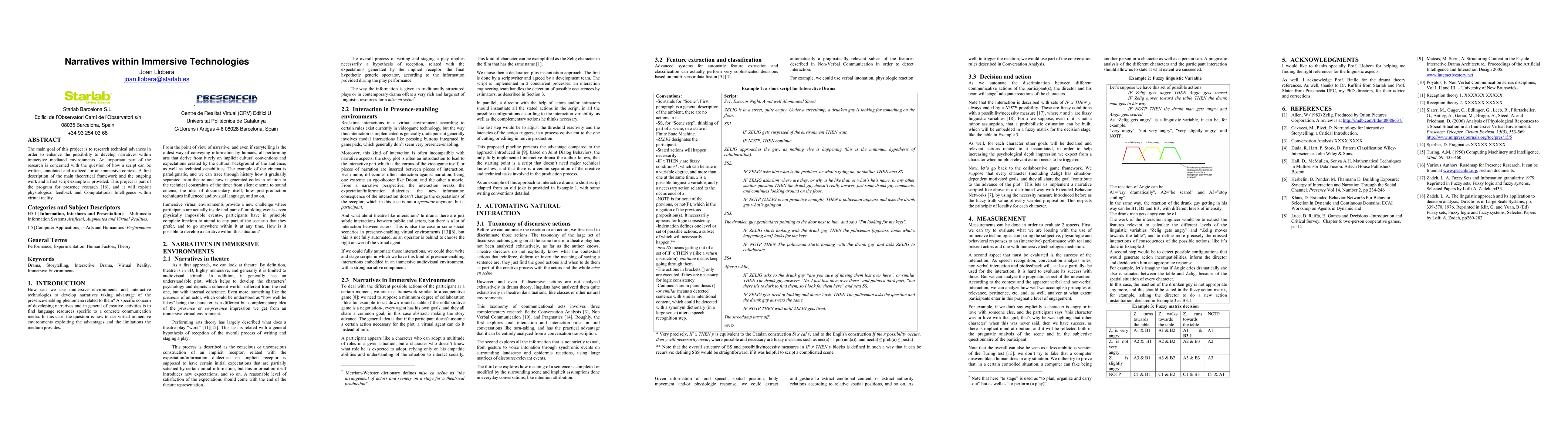 The main goal of this project is to research technical advances in order to enhance the possibility to develop narratives within immersive mediated environments. An important part of the research is concerned with the question of how a script can be written, annotated and realized for an immersive context. A first description of the main theoretical framework and the ongoing work and a first script example is provided. This project is part of the program for presence research, and it will exploit physiological feedback and Computational Intelligence within virtual reality.