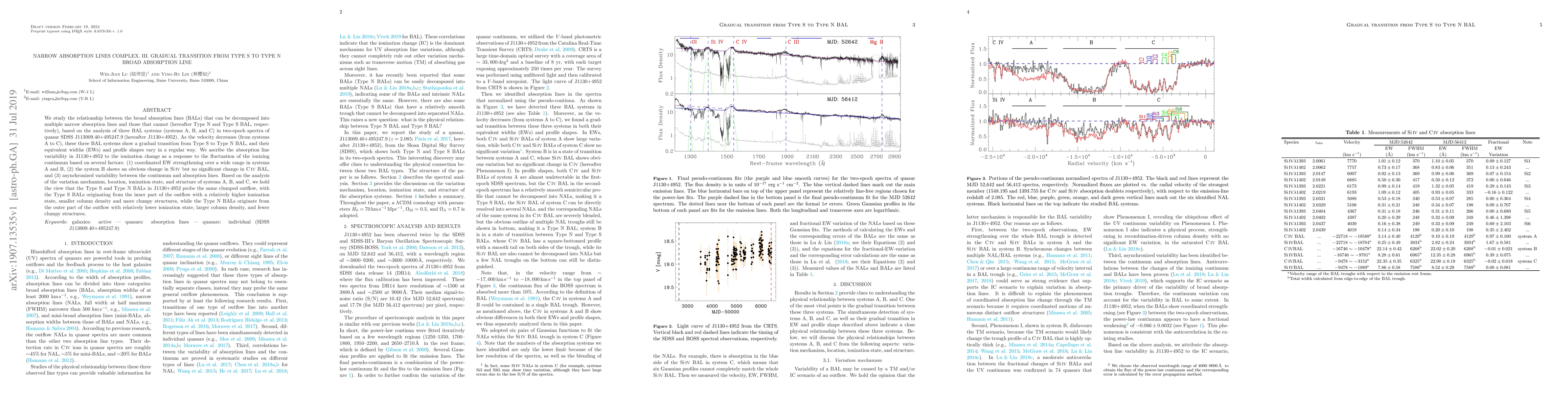 Research shows a gradual transition from Type S to Type N Broad Absorption Lines in a quasar's spectrum, indicating different ionization states and structures of the outflow.