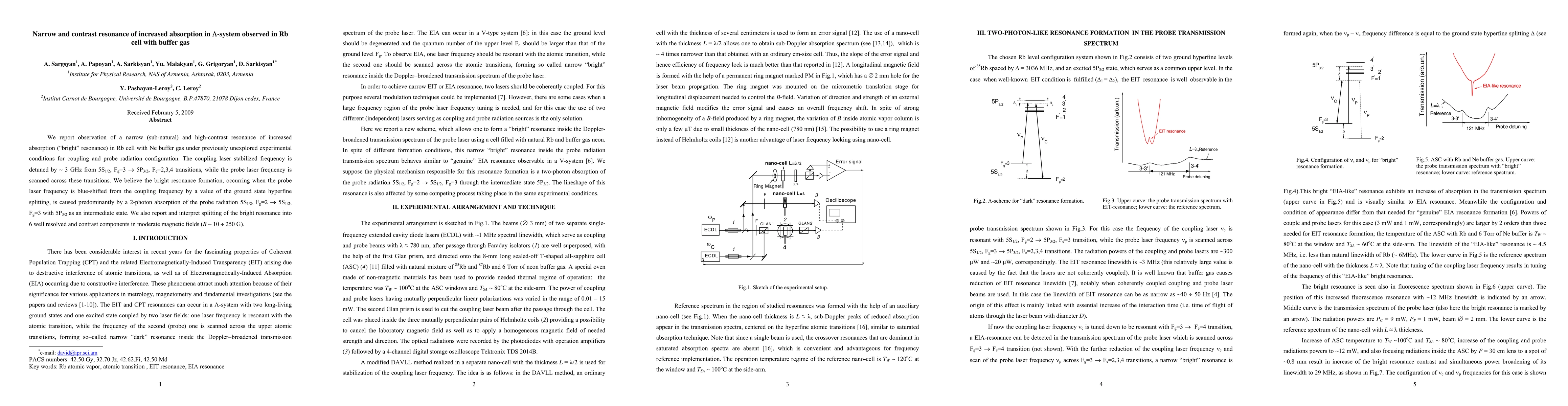 This paper reports the observation of a narrow and high-contrast "bright" resonance in a Rb cell with Ne buffer gas, caused by a 2-photon absorption process. The resonance splits into six components under moderate magnetic fields, indicating a novel coupling and probe radiation configuration.