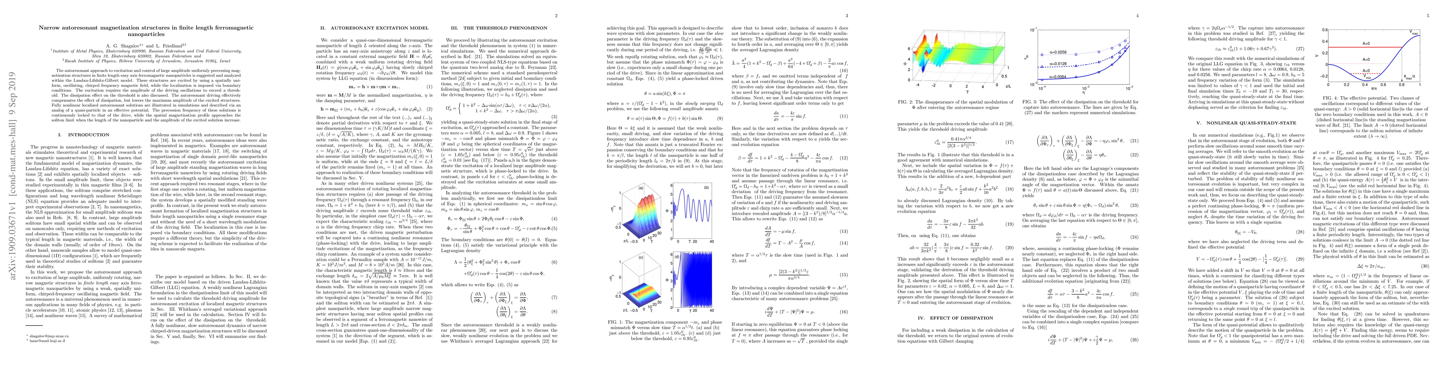The autoresonant approach to excitation and control of large amplitude uniformly precessing magnetization structures in finite length easy axis ferromagnetic nanoparticles is suggested and analyzed within the Landau-Lifshitz-Gilbert model. These structures are excited by using a spatially uniform, oscillating, chirped frequency magnetic field, while the localization is imposed via boundary conditions. The excitation requires the amplitude of the driving oscillations to exceed a threshold. The dissipation effect on the threshold is also discussed. The autoresonant driving effectively compensates the effect of dissipation, but lowers the maximum amplitude of the excited structures. Fully nonlinear localized autoresonant solutions are illustrated in simulations and described via an analog of a quasi-particle in an effective potential. The precession frequency of these solutions is continuously locked to that of the drive, while the spatial magnetization profile approaches the soliton limit when the length of the nanoparticle and the amplitude of the excited solution increase.