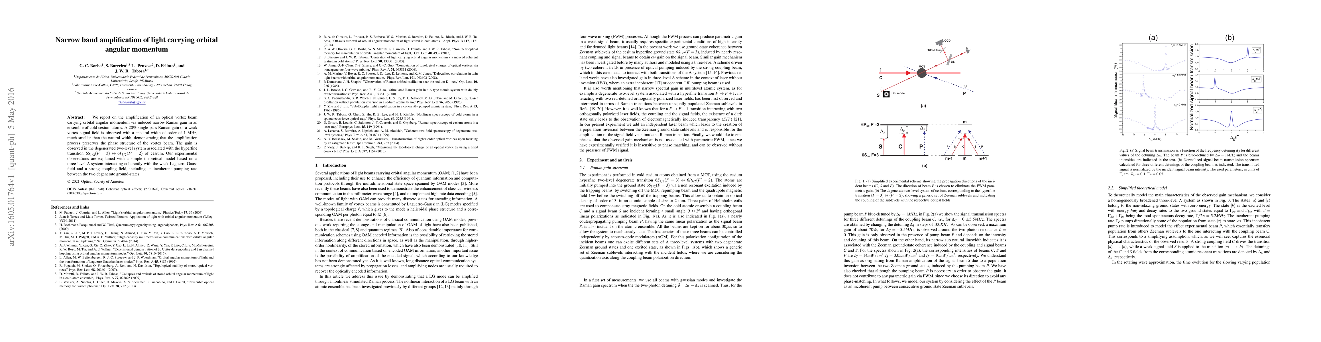 This paper demonstrates the amplification of an optical vortex beam with orbital angular momentum using narrow Raman gain in cold cesium atoms, achieving a 20% single-pass gain while preserving the beam's phase structure. The theoretical model explains the process through a three-level $\Lambda$ system interaction.