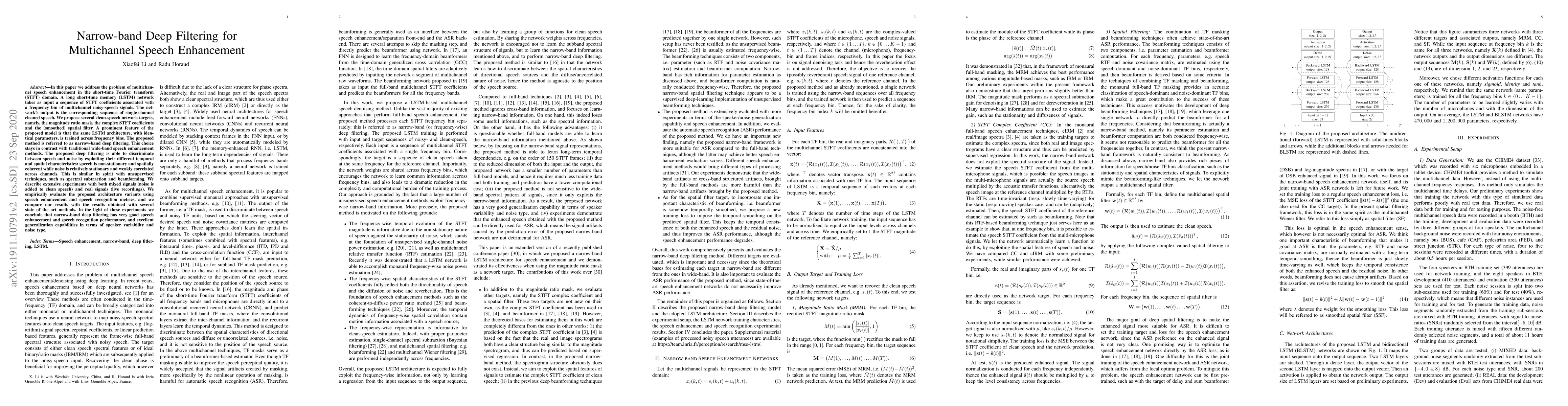 In this paper, we address the problem of multichannel speech enhancement in the short-time Fourier transform (STFT) domain. A long short-time memory (LSTM) network takes as input a sequence of STFT coefficients associated with a frequency bin of multichannel noisy-speech signals. The network's output is the corresponding sequence of single-channel cleaned speech. We propose several clean-speech network targets, namely, the magnitude ratio mask, the complex STFT coefficients and the (smoothed) spatial filter. A prominent feature of the proposed model is that the same LSTM architecture, with identical parameters, is trained across frequency bins. The proposed method is referred to as narrow-band deep filtering. This choice stays in contrast with traditional wide-band speech enhancement methods. The proposed deep filtering is able to discriminate between speech and noise by exploiting their different temporal and spatial characteristics: speech is non-stationary and spatially coherent while noise is relatively stationary and weakly correlated across channels. This is similar in spirit with unsupervised techniques, such as spectral subtraction and beamforming. We describe extensive experiments with both mixed signals (noise is added to clean speech) and real signals (live recordings). We empirically evaluate the proposed architecture variants using speech enhancement and speech recognition metrics, and we compare our results with the results obtained with several state of the art methods. In the light of these experiments we conclude that narrow-band deep filtering has very good speech enhancement and speech recognition performance, and excellent generalization capabilities in terms of speaker variability and noise type.