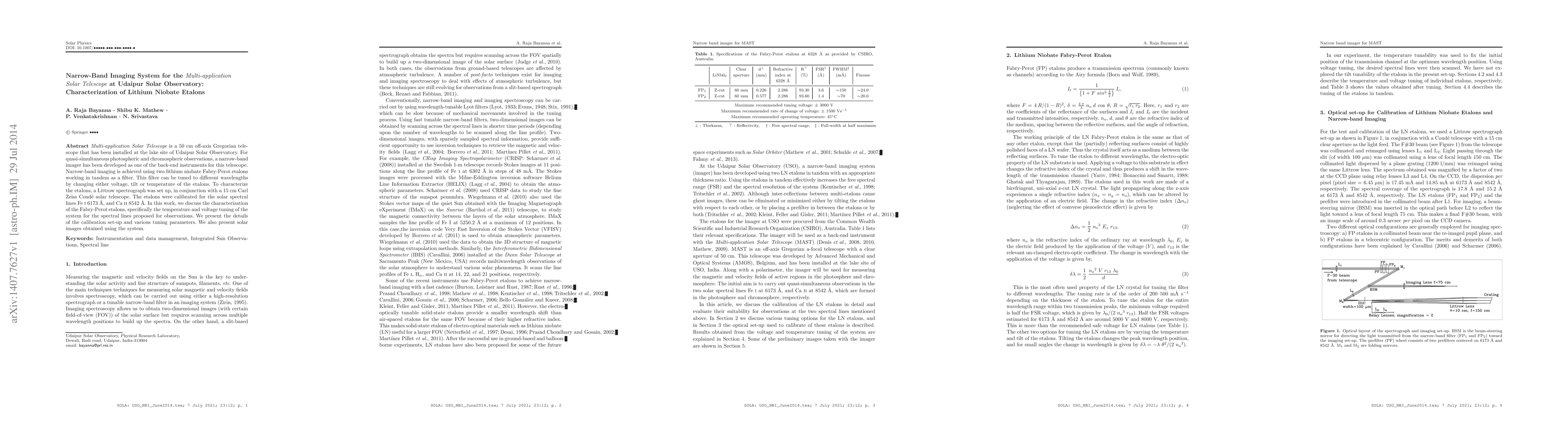 This paper details the development and characterization of a narrow-band imaging system using lithium niobate Fabry-Perot etalons for the Multi-application Solar Telescope at Udaipur Solar Observatory. The etalons were calibrated using a Littrow spectrograph and tuned for specific solar spectral lines, demonstrating the system's capability for quasi-simultaneous photospheric and chromospheric observations.