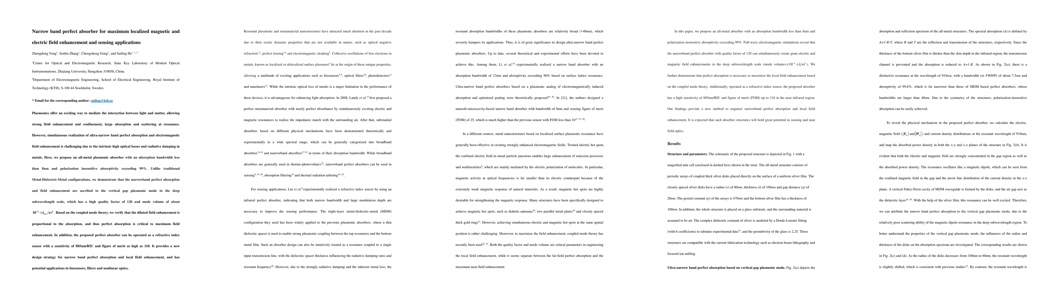 Researchers have designed an ultra-narrow band perfect absorber that can enhance both magnetic and electric fields while also serving as a highly sensitive refractive index sensor.