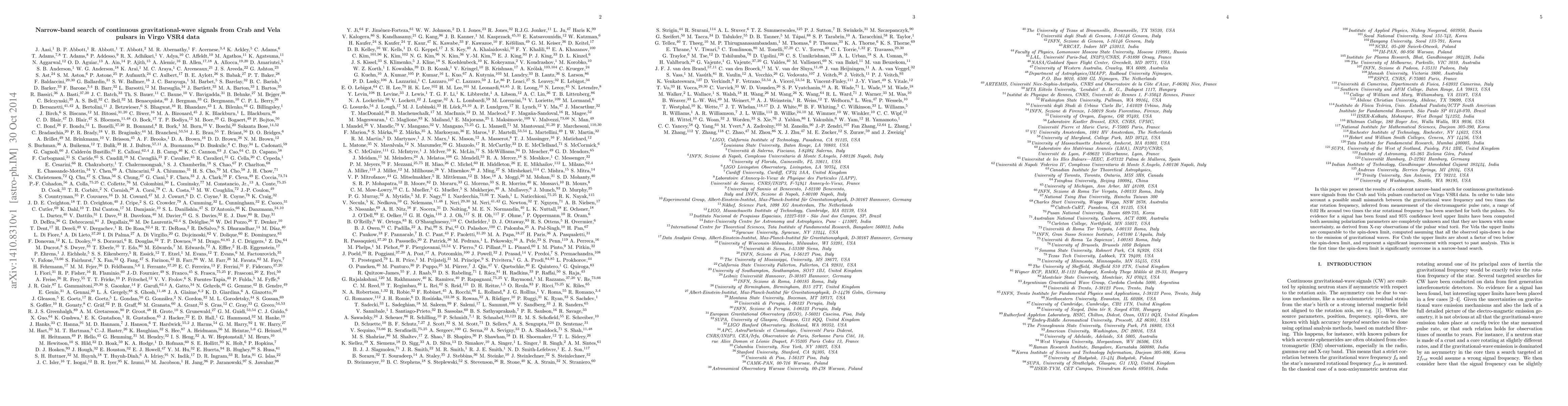 This paper reports a narrow-band search for continuous gravitational-wave signals from Crab and Vela pulsars using Virgo VSR4 data, finding no evidence for such signals. The study sets new upper limits on the emission, significantly improving previous constraints for Crab.