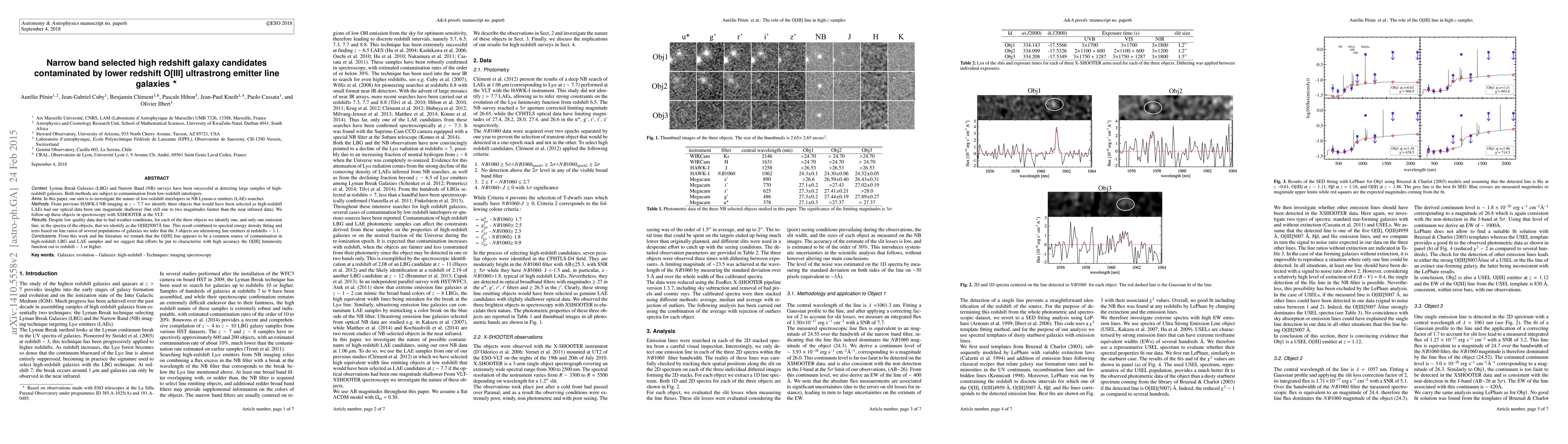 Context. Lyman Break Galaxies (LBG) and Narrow Band (NB) surveys have been successful at detecting large samples of high-redshift galaxies. Both methods are subject to contamination from low-redshift interlopers. Aims. In this paper, our aim is to investigate the nature of low-redshift interlopers in NB Lyman-$\alpha$ emitters (LAE) searches. Methods. From previous HAWK-I NB imaging at z $\sim$7.7 we identify three objects that would have been selected as high-redshift LAEs had our optical data been one magnitude shallower (but still one to two magnitudes fainter than the near infrared data). We follow-up these objects in spectroscopy with XSHOOTER at the VLT. Results. Despite low quality data due to bad weather conditions, for each of the three objects we identify one, and only one emission line, in the spectra of the objects, that we identify as the O[III]5007A line. This result combined to spectral energy density fitting and tests based on line ratios of several populations of galaxies we infer that the 3 objects are ultrastrong line emitters at redshifts $\sim$1.1. Conclusions. From this work and the literature we remark that the O[III] line appears to be a common source of contamination in high-redshift LBG and LAE samples and we suggest that efforts be put to characterize with high accuracy the O[III] luminosity function out to redshift $\sim$3 or higher.