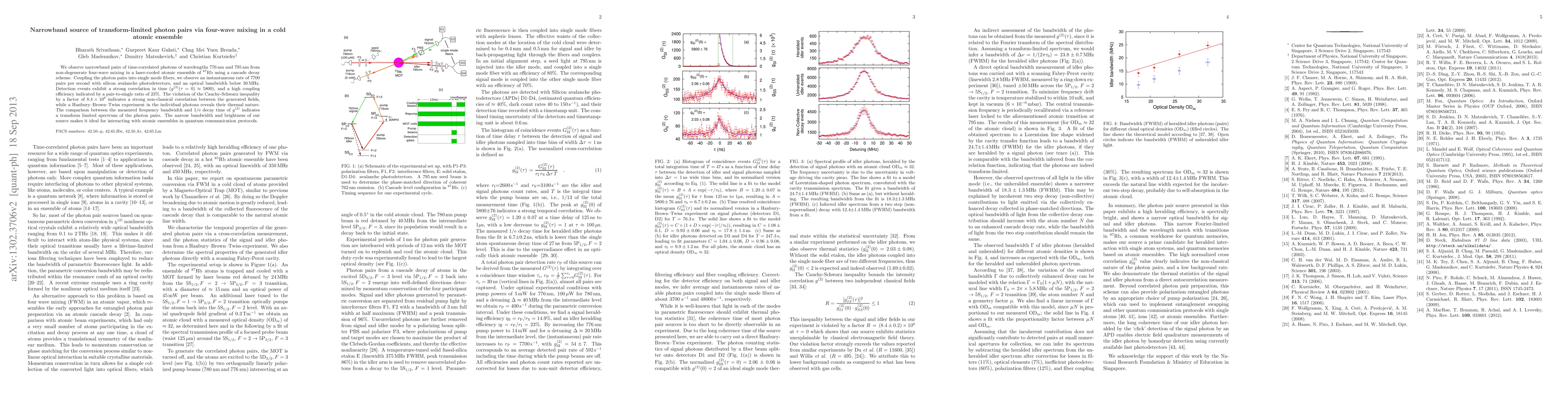 This paper reports the generation of narrowband, transform-limited photon pairs via non-degenerate four-wave mixing in a cold atomic ensemble of $^{87}$Rb, achieving high efficiency and strong temporal correlation, making it suitable for quantum communication applications. The source exhibits a narrow optical bandwidth and high brightness, with a pair-to-single ratio of 23% and strong non-classical correlations.