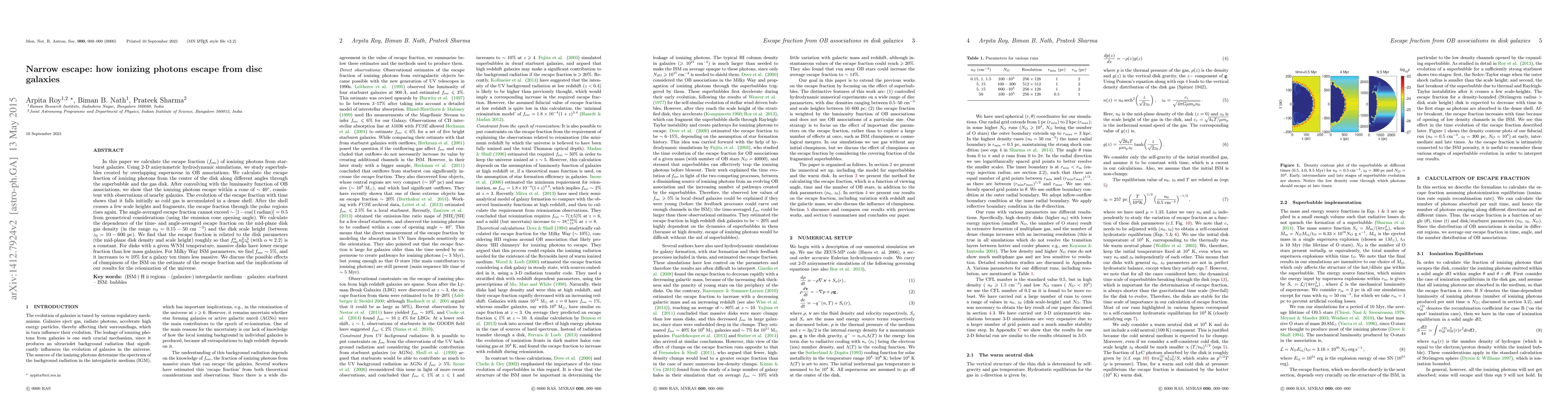 This paper calculates the escape fraction of ionizing photons from starburst galaxies using hydrodynamic simulations, showing that the escape occurs within a cone of $\sim 40^\circ$. The escape fraction is found to depend on disk gas density and scale height, with lower escape fractions in massive disks, and estimates around $5\%$ for Milky Way parameters.