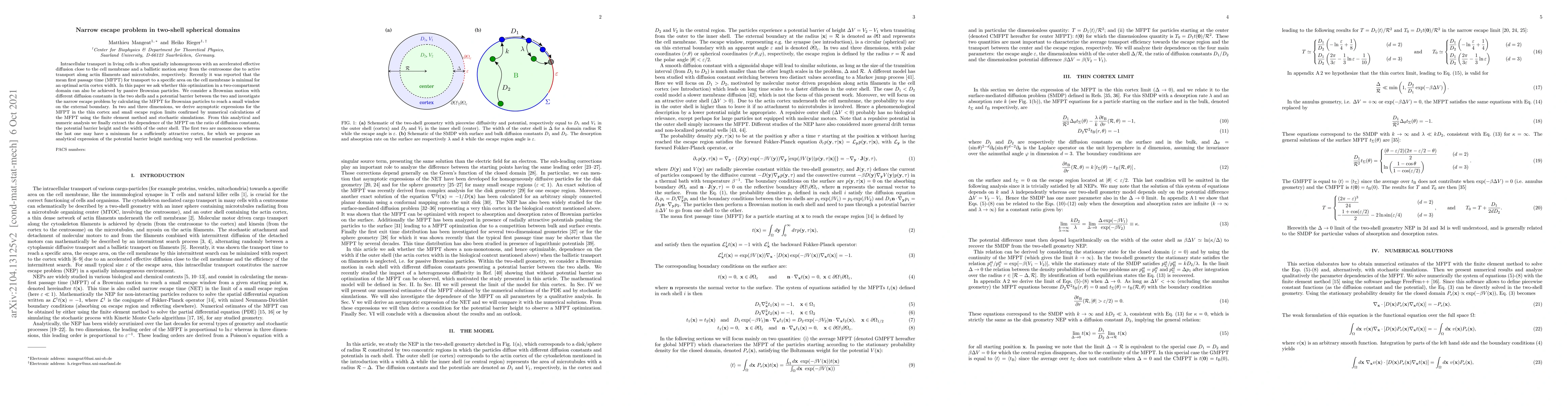Intracellular transport in living cells is often spatially inhomogeneous with an accelerated effective diffusion close to the cell membrane and a ballistic motion away from the centrosome due to active transport along actin filaments and microtubules, respectively. Recently it was reported that the mean first passage time (MFPT) for transport to a specific area on the cell membrane is minimal for an optimal actin cortex width. In this paper we ask whether this optimization in a two-compartment domain can also be achieved by passive Brownian particles. We consider a Brownian motion with different diffusion constants in the two shells and a potential barrier between the two and investigate the narrow escape problem by calculating the MFPT for Brownian particles to reach a small window on the external boundary. In two and three dimensions, we derive asymptotic expressions for the MFPT in the thin cortex and small escape region limits confirmed by numerical calculations of the MFPT using the finite element method and stochastic simulations. From this analytical and numeric analysis we finally extract the dependence of the MFPT on the ratio of diffusion constants, the potential barrier height and the width of the outer shell. The first two are monotonous whereas the last one may have a minimum for a sufficiently attractive cortex, for which we propose an analytical expression of the potential barrier height matching very well the numerical predictions.