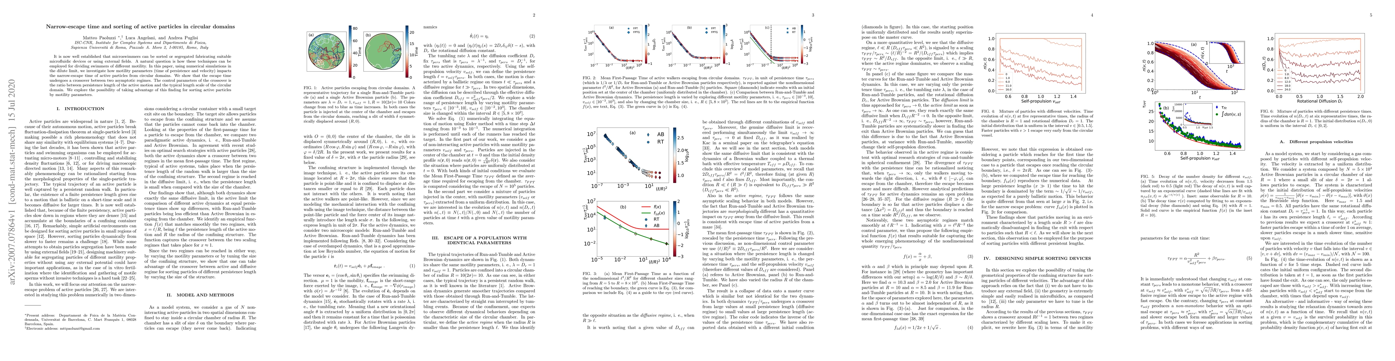 Researchers investigate how microswimmers can be sorted based on their motility parameters by analyzing their narrow-escape time from circular domains. They find a crossover point that could enable sorting of active particles by velocity.