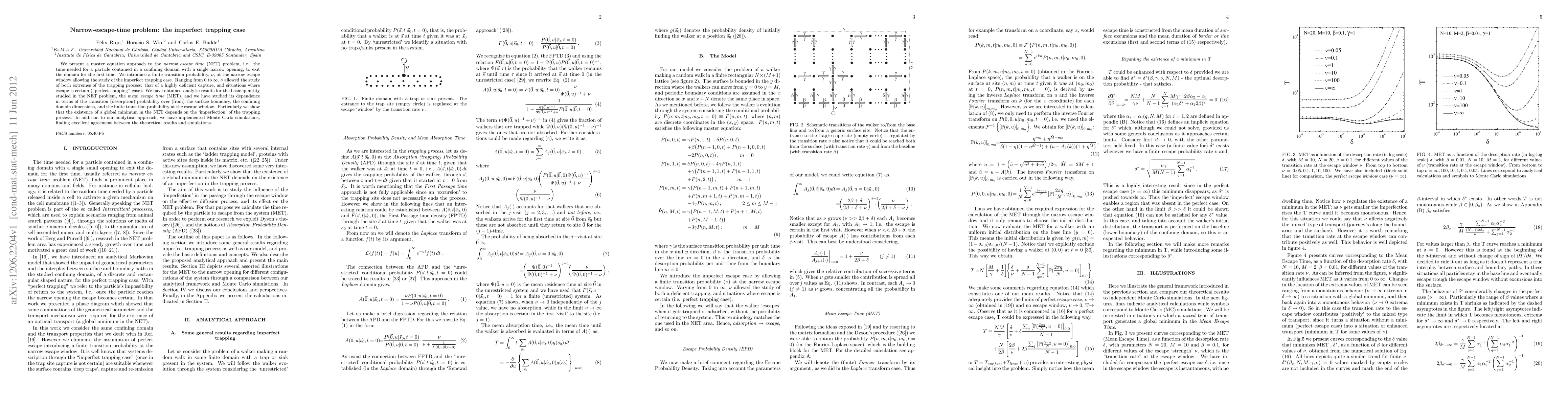 The research employs a master equation approach to study the narrow escape time problem, introducing a finite transition probability, $ u$, to analyze the imperfect trapping case. Analytic results for the mean escape time (MET) are obtained using Dyson's technique, examining its dependence on transition probability, domain dimensions, and finite transition probability at the escape window.
