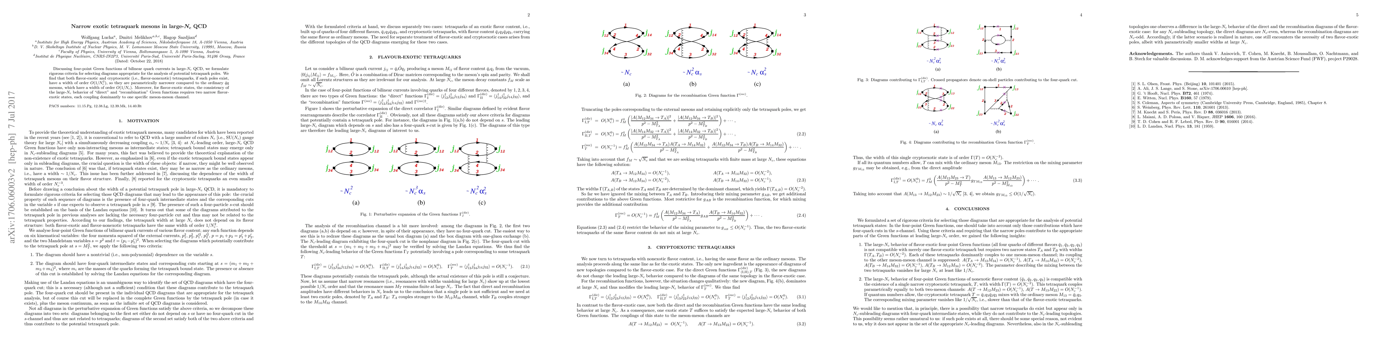 Discussing four-point Green functions of bilinear quark currents in large-$N_c$ QCD, we formulate rigorous criteria for selecting diagrams appropriate for the analysis of potential tetraquark poles. We find that both flavor-exotic and cryptoexotic (i.e., flavor-nonexotic) tetraquarks, if such poles exist, have a width of order $O(1/N_c^2)$, so they are parametrically narrower compared to the ordinary $\bar qq$ mesons, which have a width of order $O(1/N_c)$. Moreover, for flavor-exotic states, the consistency of the large-$N_c$ behavior of "direct" and "recombination" Green functions requires two narrow flavor-exotic states, each coupling dominantly to one specific meson-meson channel.